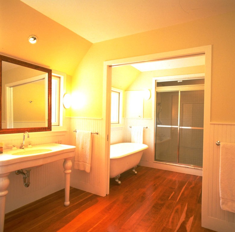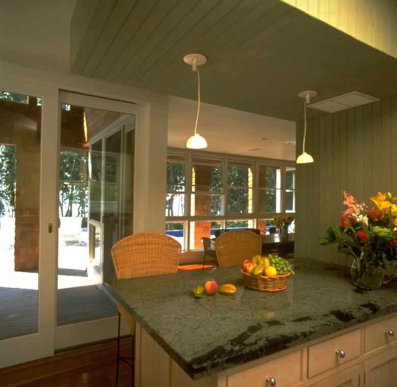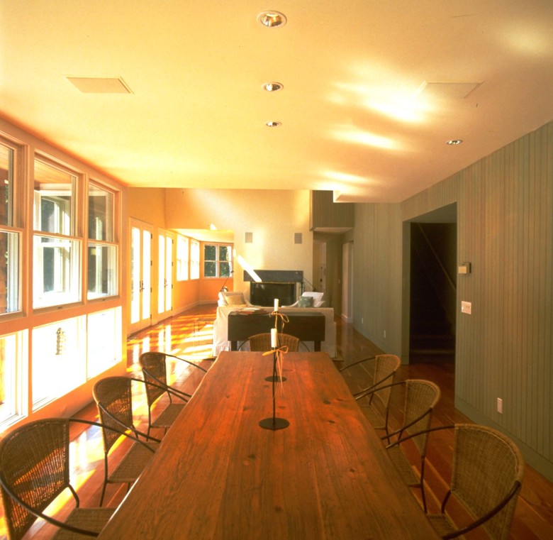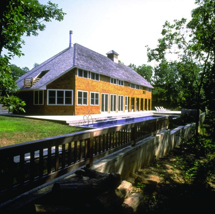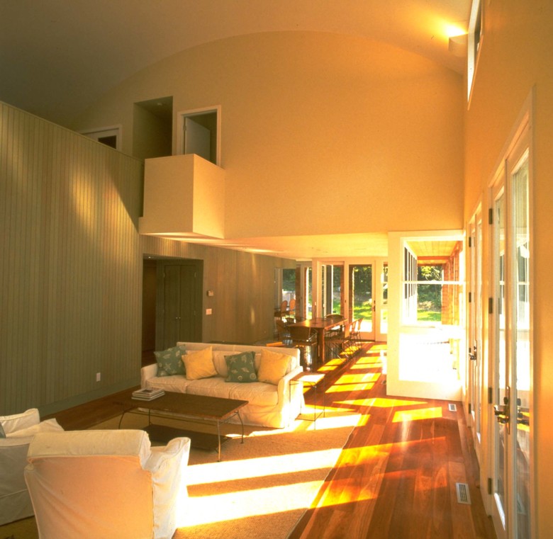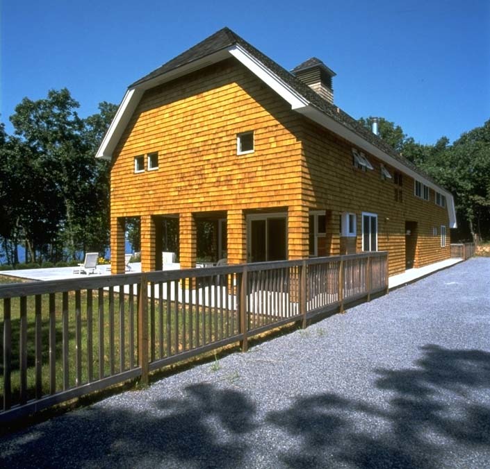 The client sought the romance of a nineteenth century country house, such as that featured in the film Howard’s End, yet wanted to enjoy all of the conveniences and advantages of urban living. To create this, the client’s passion for the English country house was combined with the modernity and fluidity of a modern loft. The house itself is situated on a dramatically sloping landscape at a waterfront edge. Traditional house elements -- pitched roofs and vaulted ceilings -- powerfully recreate bright, large-scale country spaces within a clean, modern context. Living and dining rooms are oriented west to capture views of Long Island Sound and its spectacular sunsets. Meanwhile, rich time-tested materials such as cherrywood plank floors and cedar for the deck, shakes and boards retain old world intimacy and warmth -- all without sacrificing easy maintenance. Carefully considered detailing bridges the past and present. Huge expanses of glass, hand-ragged paint finishes, and the best of vernacular design define this space