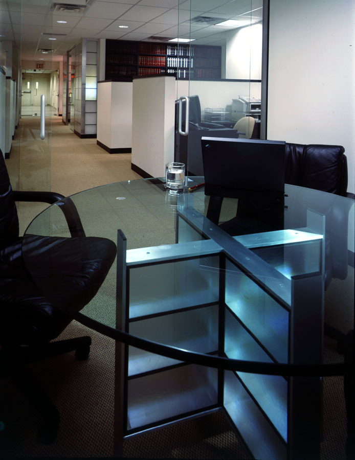 The Law office expresses a refined modern environment to reflect the sophisticated and progressive services provided by a law firm that distinguish themselves from traditional law firms. An uncommonly handsome office of architecture and custom furniture was designed for well below average cost. The plan is a naturally lit service core comprised of support staff, libraries and conference room surrounded by fourteen perimeter offices for twenty-eight lawyers. Translucent fiberglass panels permit light to penetrate through the perimeter offices to the central core. This use of a low-cost industrial enclosure system combines practicality and elegance for this non-traditional law firm.
