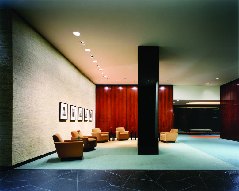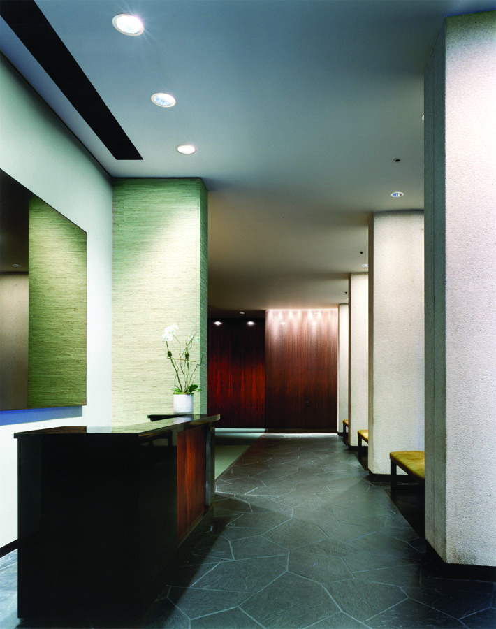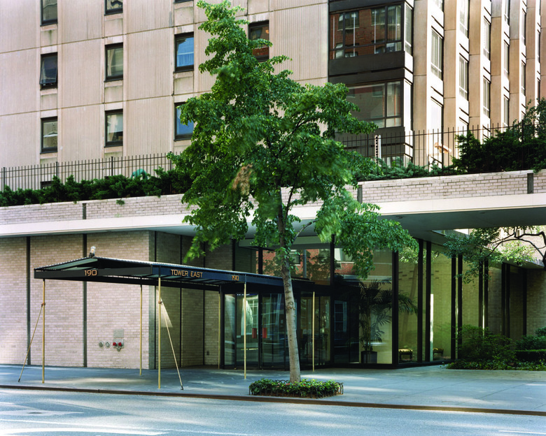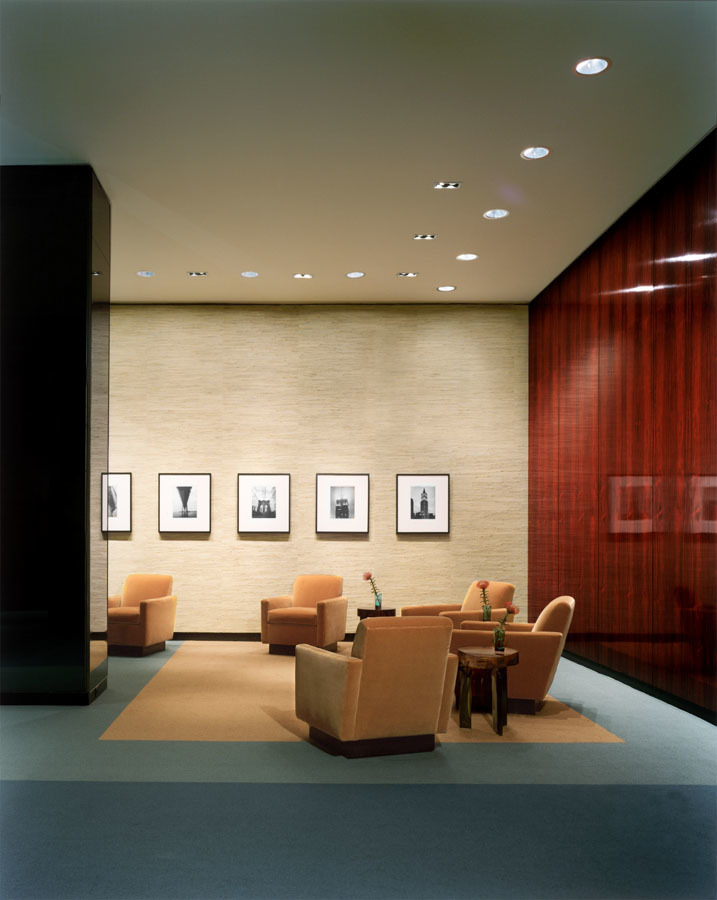 The Lobby is located in a residential building designed by Emory Roth and Partners and erected circa 1961. The design concept was to create a warm and inviting space by enhancing original details with color and materials in keeping with fundamental modernist traditions. A color scheme was developed to compliment existing materials and enhance a variety of focal points. The Tower East design focused on refurbishing existing materials, such as the Brazilian rosewood and the terrazzo columns. New dynamic features such as a Concierge desk, bronze framed mirror, bronzed bead curtain, architectural lighting, gilded coffer, richly colored and textured furniture and carpet, were added to create an elegant and comfortable atmosphere. The basic modernist credo of blurring the spatial distinction of the outside to the inside is maintained and enhanced. The Tower East lobby renovation remains true and respectful to modernist precepts of the early moderns while harking boldly to the future.