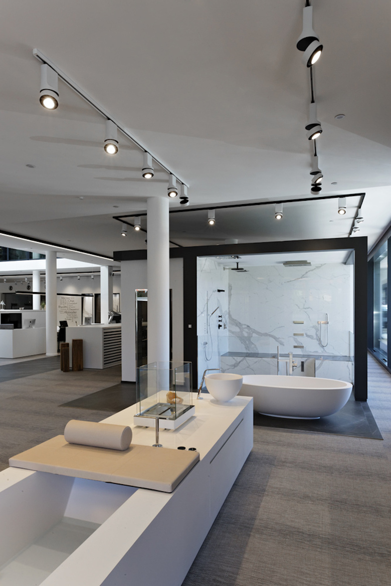 Im Randbereich nimmt die offen belassene Raumfläche sogenannte Highlights auf, die auf relativ kleinem Raum vielseitige Möglichkeiten zeigen. Beim Eintreten in den Showroom gerät das Highlight „Bad“ mit seiner technisch hochwertigen Sanitärausstattung unmittelbar in das Blickfeld des Kunden. Hier kann er sich von einem Regenhimmel, einem Wasserfall oder Seitenduschen sowie von manuellen und digitalen Armaturen in Funktion überzeugen. Weitere Highlights werden von den Themen Küche, Wohnen und Raumbeschallung besetzt. Auch hier erfolgt die Beleuchtung mittels Stromschienen-Strahlern der umfangreichen Produktfamilie You-Turn. Um einen Kontrast zur Pavillon-Beleuchtung zu setzen, kamen hier weiße Schienensysteme zum Einsatz.