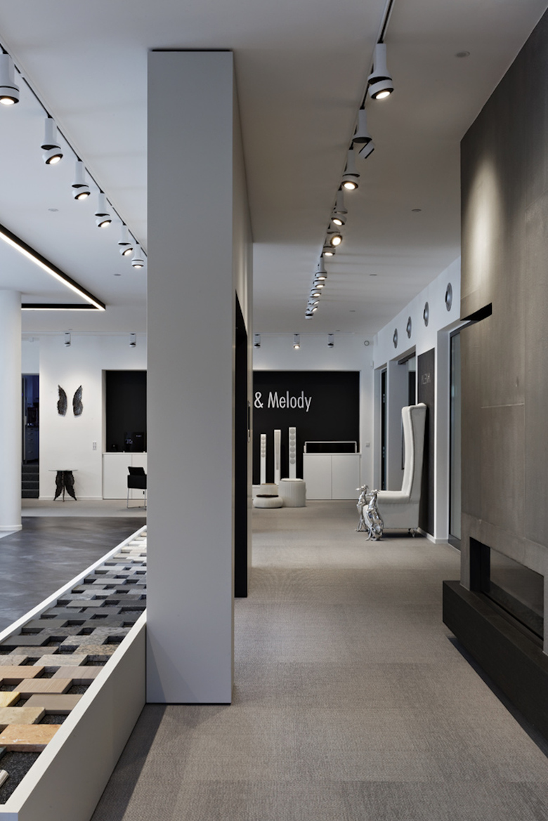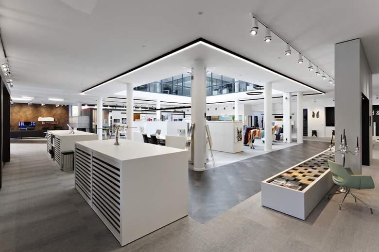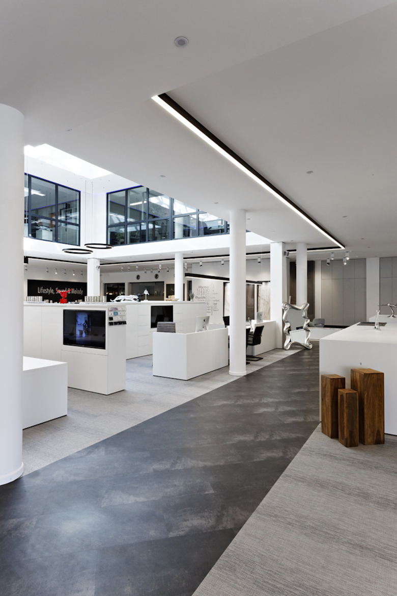 Aus einer 1.000 qm großen Rohbaufläche ließ das Krefelder Büro für Architektur und Innenarchitektur Studio Meuleneers einen Showroom entstehen, der seinesgleichen sucht. Denn bei ALENA in Gießen präsentieren sich unterschiedlichste Gewerke und Warenmuster, ohne sich ästhetisch in die Quere zu kommen. Design-Leuchten unterstützen das klare Ausbaukonzept nicht nur lichttechnisch, sondern auch formal.