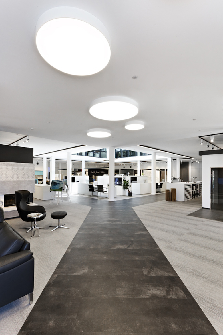 Die Allgemeinbeleuchtung des Showrooms wird über durchgängige Lichtlinien mit dem Profil Streamliner von Delta Light erzeugt. Auf Maß gefertigt und mit Eckverbindern versehen, umlaufen sie das Mittelfeld der Ausstellungsfläche und betonen damit das Atrium, in dem zwei dekorative Super-Oh Kronleuchter schweben. Über zusätzliche abgependelte Streamliner-Profile werden die Beratertische normgerecht beleuchtet. Die besondere Stellung des Entrées signalisieren großformatige Supernova Leuchten, die an der Betondecke montiert sind. In verschiedenen Durchmessern und in freier Gruppierung geleiten sie den Kunden mit ausgezeichnetem Licht für die Allgemeinbeleuchtung ins Zentrum des Ausstellungsraums.