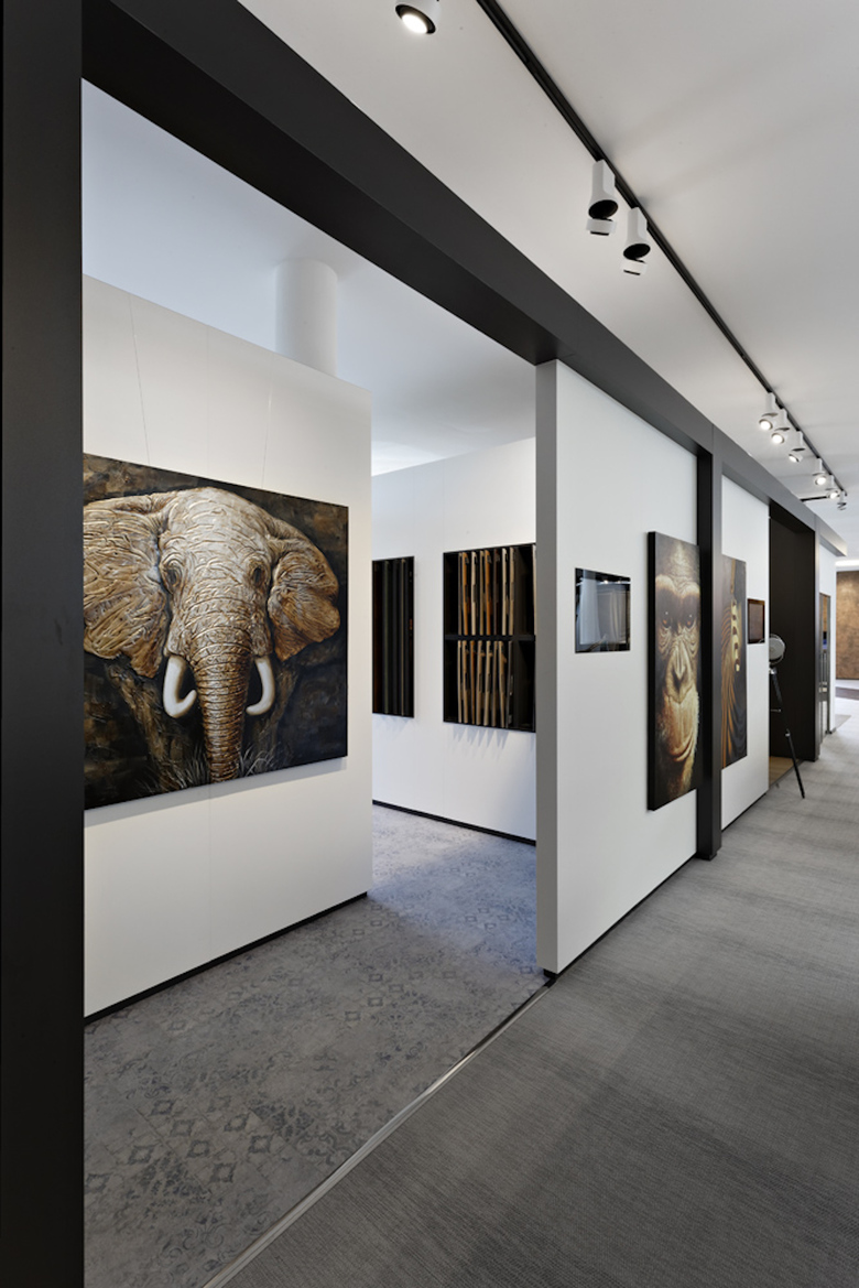 Auf 4.700 qm vereint der viergeschossige Neubau in Gießen rund um ein zentrales Atrium zahlreiche – teils fremd vermietete – Büros und eine 1.000 qm große von Stützen getragene Ausstellungsfläche im Erdgeschoss. Mit der Strukturierung, Gestaltung und dem Ausbau dieser Fläche, dem neu zu erschaffenden ALENA Showroom, beauftragte der Bauherr die Krefelder Innenarchitekten Meuleneers, die zu Auftragsbeginn eine reine Rohbaufläche vorfanden. Erwartet wurde ein Konzept, das jedes der bei Alena vertretenen interdisziplinären Gewerke ins rechte Licht stellt und gleichzeitig eine von Klarheit geprägte Gesamtpräsentation unter der Marke ALENA generiert. Das Studio entwickelte ein Konzept aus 18 qm großen, nach oben offenen Themen-Pavillons in Holzbauweise, die sich entlang der Fassaden um eine im Bereich des Atriums positionierte Beratungsfläche gruppieren. Auf den hier ursprünglich geplanten Treppenaufgang war zugunsten eines frei bespielbaren Mittelfelds verzichtet worden. Die für die Pavillons eigens entworfenen und von Möbelschreinern hergestellten Schränke und Präsentationssysteme nehmen Muster, Broschüren und Kataloge zu Farben und Tapeten, Fliesen, Parkett, textilen Bodenbelägen, Stoffen und Sonnenschutzsystemen auf. Die geordnet abgelegten Informationsmaterialien sind somit stets griffbereit, ohne den Gesamteindruck der Ausstellung zu stören. Vor den Pavillons können die Muster interessierten Kunden auf ebenfalls speziell angefertigten Tischen sauber vorgestellt werden.