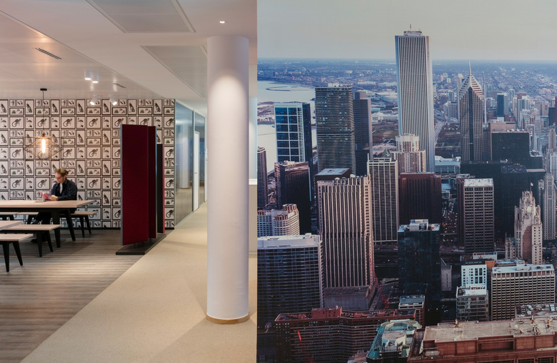 In den Teeküchen, die LEPEL & LEPEL als Kommunikationszonen ausgebildet haben, schirmen kubische Tresen den zeitgeistig möblierten Aufenthaltsbereich von der Küchenzeile ab. Je nach Erdteil-Motto zeigen sich die Theken mal in robustem Kortenstahl, mal farbenfroh gefliest oder kühl urban. Gleiches gilt für die Möblierung, die Farbigkeit und die Wände. Lediglich die Bodenbeläge sind in jeder Teeküche einheitlich aus Vinyl in Holzoptik. Jeweils zwei dimmbare, mit LED bestückte Boxy-Pärchen mit einem Abstrahlwinkel von 33° liefern die Allgemeinbeleuchtung, resp. die Anstrahlung der Motivwände. Ein Einbau der Leuchten war in der Kühlpaneeldecke konstruktiv schwer möglich, so dass alle mieterseitigen Ausbauten als Aufbaumontage erfolgten. Während die Montage der Boxy Downlights somit direkt an der Decke realisiert werden konnte, ermöglicht ein zusätzliches Gelenk an den um 90° schwenkbaren und bis zu 350° drehbaren Richtstrahlern eine individuelle Ausrichtung des Lichtes. Bei der Leuchten-Auswahl war diese Flexibilität in der Wahl der Lichtrichtung eine wesentliche Prämisse. Denn die Teeküchen bilden auch den Rahmen für kleinere Mitarbeiter-Events, anlässlich derer die Möblierung temporär umgestellt wird. Dann kann das Licht mittels der Strahler einfach dorthin gebracht werden, wo es gebraucht wird.
