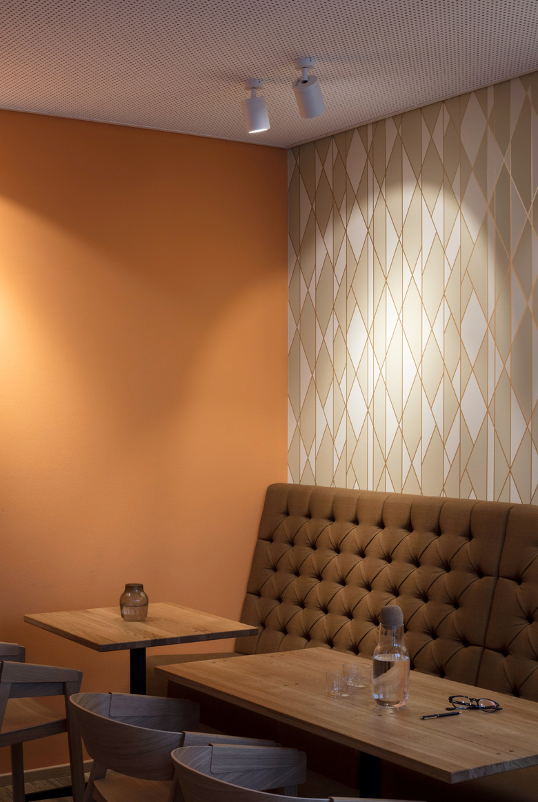 Die Konferenzräume sind nach den Metropolen benannt, in denen HRS eine Niederlassung betreibt. Eine Motivwand, die ein markantes Bauwerk aus Städten wie Warschau, Mumbai, Shanghai u.a. abbildet, sowie geradezu allegorisch ausgewählte Pendelleuchten verleihen ihnen ihre jeweilige Adresse. Zusätzlich findet sich das Städtemotiv als Grafik auf der zum Flur abschirmenden Glaswand. Auch hier sor- gen Boxy-Downlights von Delta Light für eine normgerechte und homogene Grundbeleuchtung mit brillantem Licht.