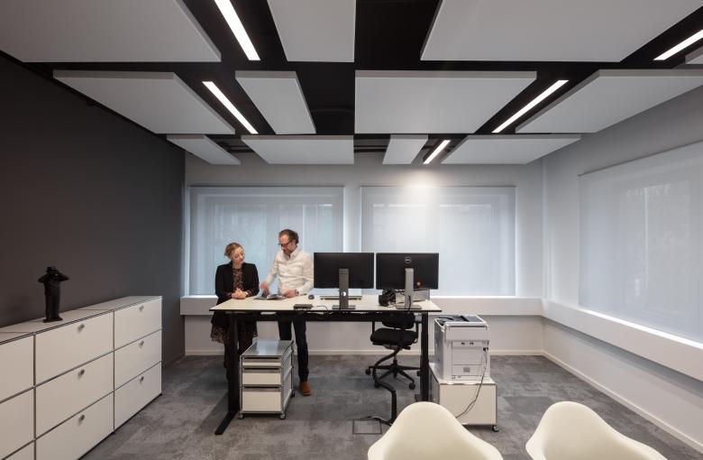 Im Obergeschoss entstand ein weiteres großzügiges offenes Team-Büro. Hier wurde die Decke – wie auch in allen anderen Büros mit rechteckiger Raumgeometrie – mit abgehängten akustisch wirksamen Kühlelementen gestaltet. Dazu definierten die Planungsbeteiligten drei Formate, welche sie raumbezogen zu dynamischen Deckenbildern konfigurierten. Streamliner-Profile mit prismatischen Abdeckungen für die normgerechte blendfreie Bildschirmarbeit sind flächenbündig in die Zwischenräume integriert. Vor dem Hintergrund der geschwärzten Rohdecke scheinen die Kühlelemente und Lichtlinien in den Räumen zu schweben.