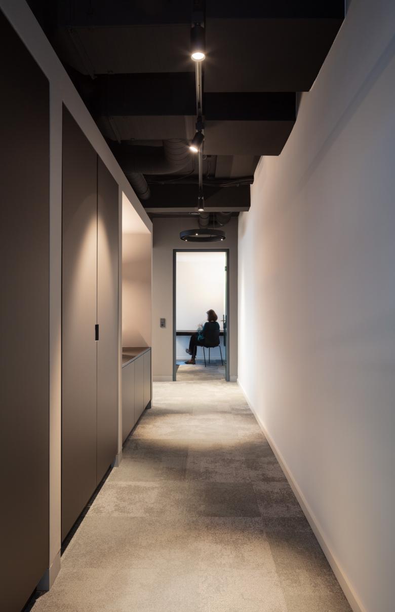 Dank Überarbeitung und Erweiterung der Eingangszone entstand ein großzügiger Empfangsbereich mit Stehtresen und zugeordnetem Coffee-Point für Gäste. Ein unterleuchtetes schwarzes skulpturales Empfangsmöbel, das sich dem eintretenden Besucher einladend zu-wendet, wird als zentrales Element des Foyers von drei Supernova-Deckenaufbauleuchten hervorgehoben. Deren zusätzlicher indirekter Lichtanteil legt sich als Aureole um jede Leuchte und hellt die weiße Akustikdecke auf. Nach diesem Blickfang schweift das Auge sofort zu dem markanten schwarzen Leuchtenprofil, das die Längsachse des Flurs raumstrukturierend durchschneidet und die transparenten, aber geschlossenen Arbeitsorte optisch an den öffentlichen Bereich anbin-det. Im Wechsel mit Lichtlinien für diffuses Licht nimmt das Shiftline-Profil justierbare Spy-Strahler für die Grundbeleuchtung und zur Aufhellung der Wände (Spy Focus) auf.