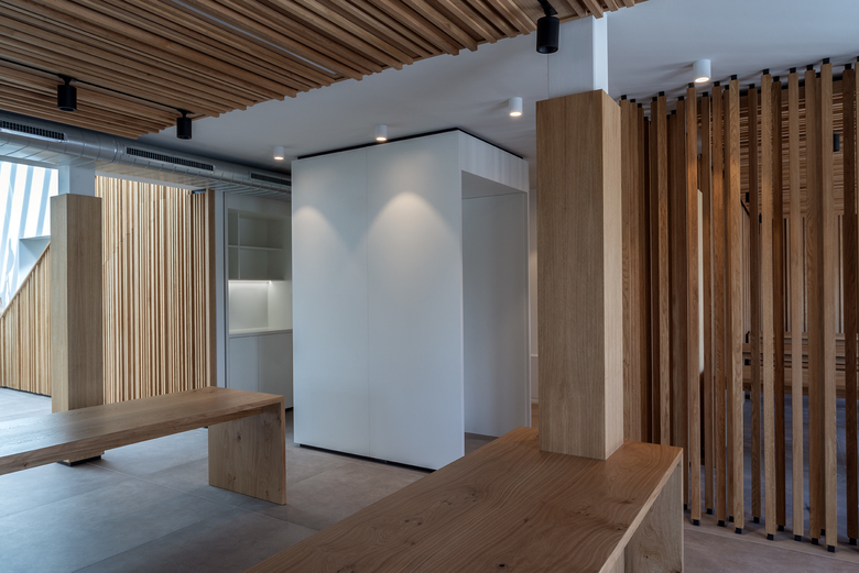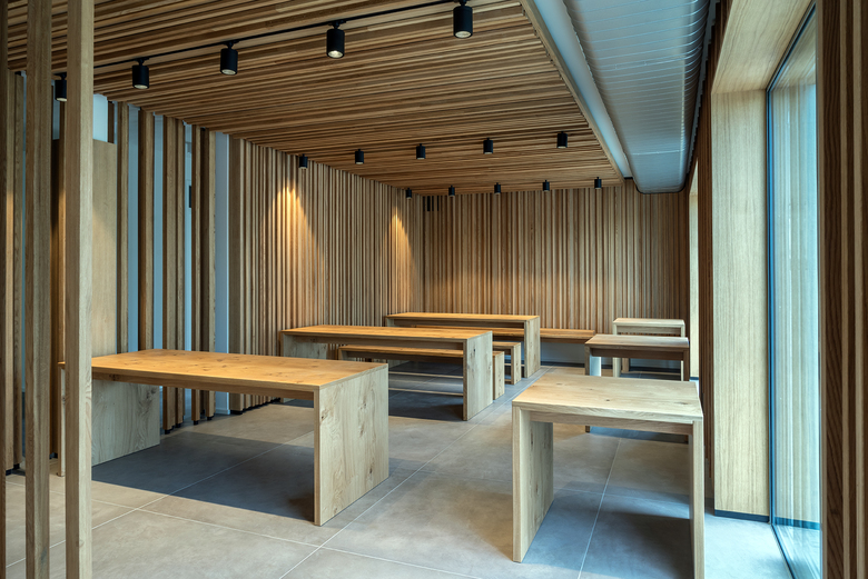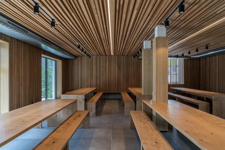 Der von einem statisch tragenden Holzstützenskelett geprägte Holz¬bau wird über ein zentrales zweigeschossiges Atrium erschlossen. Während das mittels eines Treppenaufgangs angebundene Obergeschoss sowie mehr als 50 Prozent der Grundfläche des Erdgeschosses weiterhin für Büros genutzt werden, wurde die dort verbleibende Fläche zum Gastronomiebereich umgebaut. Der quadratische Grundriss gliedert sich in eine Küchenzone mit Speisenausgabe, einen L-förmigen Restaurantbereich, eine Lounge, Sanitäranlagen sowie Stehbereiche mit Getränkeautomaten und Garderobe. Inspiriert von japanischen Holzarchitekturen, kleidete Eva Demmelhuber den Gastraum, der an einer Front von raumhohen Fenstern begrenzt wird, mit Lamellen aus gekälkter Eiche aus. Die in der unternehmenseigenen Schreinerei gefertigten Lamellen wurden auf eine perforierte, mit Mineralwolle hinterlegte Trägerplatte aufgebracht, die mit Abstandshaltern an der Decke und den Wänden montiert ist. Somit kann sie ihre raumakustische Wirkung voll entfalten. Die nach dem Entwurf der Architektin hausintern gefertigte Möblierung besteht ebenfalls aus Kalkeiche. Jeweils zwei lange Tische wurden in dem größeren Teil des Gastraums dreiachsig zwischen die mit dem gleichen Holz verkleideten vertikalen und diagonalen Stützen – ein Erbe des Bestandsge-bäudes – gesetzt. Bänke unterstützen die auch mittels der Decken-lamellen in die Tiefe des Raumes führende Linearität und sorgen für ein reduziertes und aufgeräumtes Erscheinungsbild.