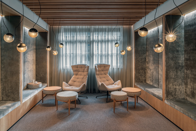Die Lounge bietet Gelegenheit zum informellen Austausch, der von der Geschäftsführung bei baierl + demmelhuber explizit gewünscht ist. Auch Kunden sind eingeladen, in den mit Samt bezogenen Alkoven oder den bequemen Sesseln in der Raummitte zu verweilen. Seine gedämpfte Atmosphäre erhält der Raum durch eine ausschließliche und zurückhaltende Fugenbeleuchtung im Möbel und im Deckenversprung. In diesen wurde unsichtbar ein Shelfline-Profil mit diffuser Abdeckung integriert, das vor Ort abgelängt und mit LEDflex-Bändern bestückt wurde. Zur Unterstützung des wohnlichen Ambien¬tes ergänzen Gibbo Leuchten die Grundbeleuchtung in der Lounge um dekoratives Licht.