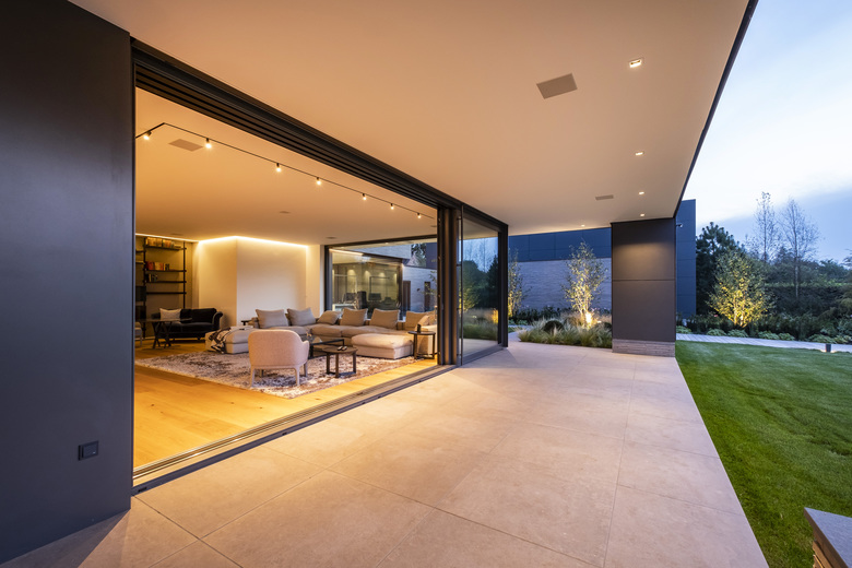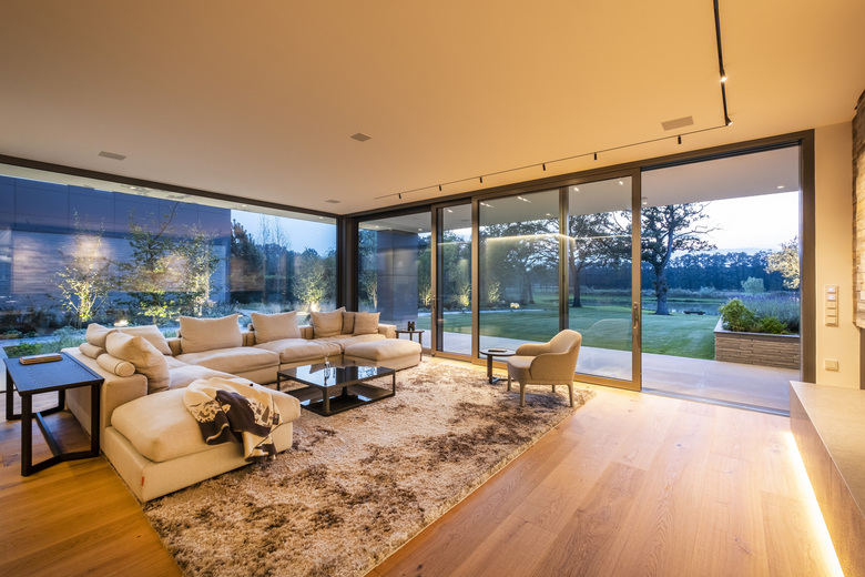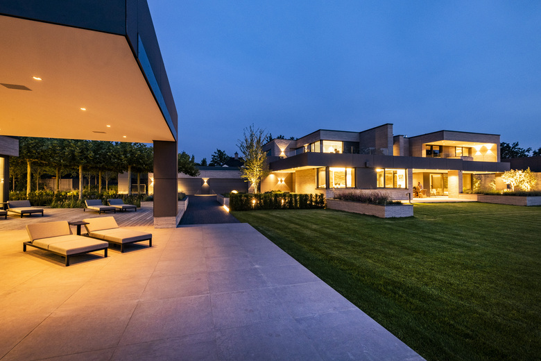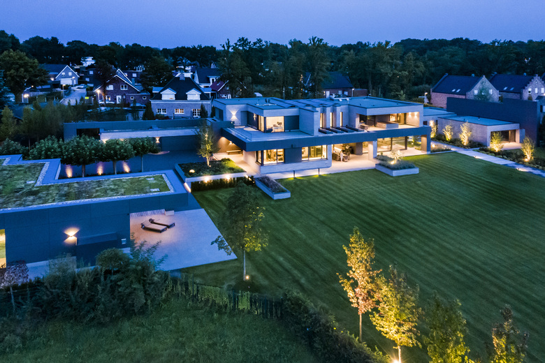 Hunderte Meter weit schweift der Blick durch die raumhohe Übereckverglasung des Wohnraums im Haupthaus über die mittels Striper-Bodeneinbauleuchten sanft illuminierten artenreichen Anpflanzungen und Bäume, über die frisch gemähte Wiese und den ausladenden See. Zur Linken erblickt man das kleine Gästehaus mit Sichtschutzwand zur benachbarten Bebauung, in der rechten Diagonalen fällt das Poolhaus mit seiner dem Grundstück zugewandten überdachten Terrasse ins Auge. Überall zeigen sich kleine Lichtpunkte. Die anthrazitfarbene Riemchenkeramik, mit welcher der auf der Ost-Westachse linear angelegte Erschließungsweg bekleidet ist, schimmert in den von kleinen Pollerleuchten gekonnt am Boden verteilten Licht-Prisen. Die hellgraue Klinkerfassade der Terrassenwand am Poolhaus wird mittels Vision-Wandleuchten dramatisch von parabolischen Lichtmustern erhellt, welche die Plastizität des keramischen Materials betonen. Soweit das Auge reicht, bietet sich dem Betrachter ein harmonischer Anblick.