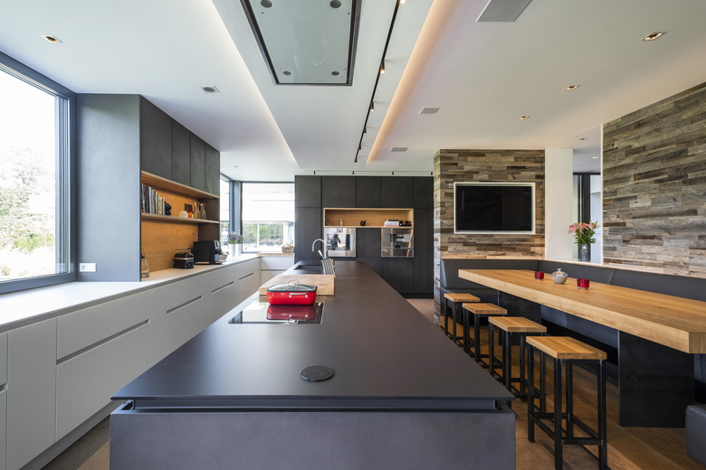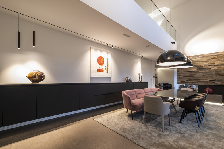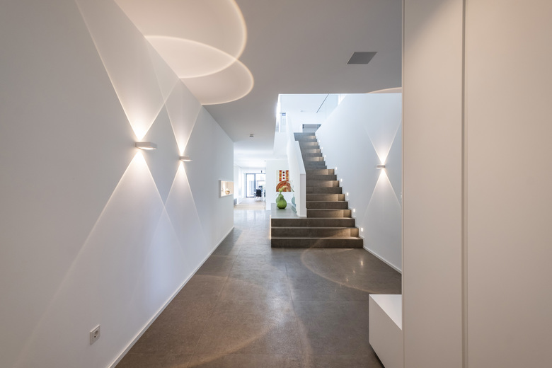 Der Innenraum ist in seiner Raumfolge von Linearität geprägt. Direkt hinter dem Ein-gangsbereich öffnet sich rechts die große Küche, die an der zum Westen weisenden Wand durchgängig Einbauschränke, im linken Bereich eine Essgruppe und in der Mitte eine Kücheninsel aufnimmt. Ihr schließen sich der partiell unterhalb eines Luftraums liegende Essbereich mit raumhoher Glasfassade und der Wohnraum – beide mit Austritt auf die Terrasse – an. In diesen drei Bereichen nehmen schmale, in die Decke integrierte Leuchtenprofile die Linearität des architektonischen Konzepts und die zurückhaltende Eleganz der Innenarchitektur auf. Sie sind mit miniaturisierten Spy-Strahlern und im Essbereich zusätzlich mit zwei Pendelleuchten derselben Produktfamilie bestückt, die alle flexibel an jeder beliebigen Stelle in das Profil geklipst werden können. Folgt man dem Flur, der sich im rückwärtigen Gebäudeteil über die Längsachse entwickelt, gelangt man zunächst in den Luftraum, in dem eine Treppe das Obergeschoss erschließt. Der Flur wird mit neun Vision-Wandleuchten erhellt, welche die Wände – wie an der Fassade des Poolhauses – spannend mit ihrer parabolischen Lichtverteilung dekorieren.
