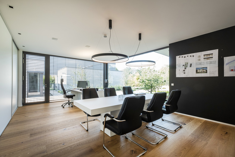 Nach Passieren eines bodentiefen, aber nur 1,80 Meter hohen Fensters, dessen obere Schließung vor Einblicken der Nachbarn schützt, gelangt man in ein großes, mit einer massiven Schiebetür versehenes Büro, das aufgrund seines Versatzes vom Wohnraum aus nicht sichtbar ist. Sofort fallen in dem mit edlem Parkett belegten Raum zwei große Pendelleuchten ins Auge, die das lineare Beleuchtungskonzept mit ihrer Ringform durchbrechen, aber der geometrischen Gestaltung die Treue halten. Die Superloop-Leuchten versorgen den Raum mit einer angenehmen blendungsminimierten Grundbeleuchtung.
