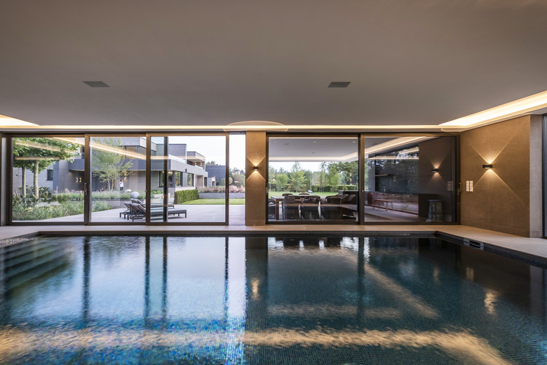Das Poolhaus empfängt mit seiner großen überdachten Terrasse und seiner verglasten Ostfassade, die den Blick auf das mit Mosaik verkleidete Schwimmbecken und den rückwärtigen Wellnessbereich freigibt. Hierbei handelt es sich um ein Bestandsgebäude, das Anja Engelshove um den Poolbereich erweitert und dem Gesamtensemble gestalte¬risch angepasst hat. So erklärt sich, dass das große, in einem Stück angelieferte Becken eingebaut werden konnte. Erst danach wurde das Dach des Anbaus unter erheblichem konstruktivem Aufwand geschlossen.