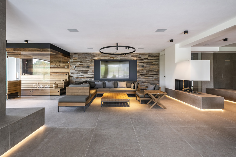 Großformatige Feinsteinzeugfliesen in Beton-Optik, die auch im Haupthaus incl. den Terrassen Verwendung finden, schmücken den Boden und setzen sich im Außenraum fort. Dem Auge scheint es, als würden Innen- und Außenraum nahtlos ineinander übergehen. Die Wand hinter dem Relax-Bereich, zwischen der verglasten Sauna zur Linken und dem Kamin zur Rechten, ist mit aufbereitetem Altholz verkleidet, das sich mit seiner grauen Patina phantastisch in das für das Gesamtensemble entwickelte zurückhaltende Farbkonzept fügt. Der Sitzbereich wird von einer Superloop-Leuchte gekrönt, die mit sechs kleinen Midispy On-Strahlern bestückt ist. Dadurch gewinnt die Beleuchtung besonders hohe Flexibilität, denn die Strahler werden einfach an jeder beliebigen Stelle des Leuchtenprofils eingeklipst und sind zudem justierbar. So kann je nach Anforderung jederzeit die geeignete Beleuchtungssituation geschaffen werden. Ein weiteres Beleuchtungs-Highlight liefern auch hier sieben Vision-Wandleuchten, die den Raum mit Licht gestalten. Anders als für das Haupthaus wählte die Architektin hier die Außenraum-Version, die mit der Schutzart IP55 für den Nassbereich geeignet ist.