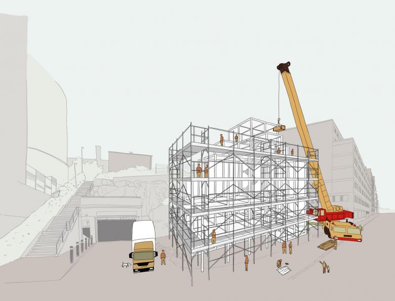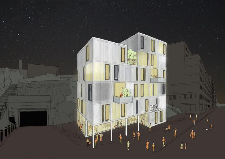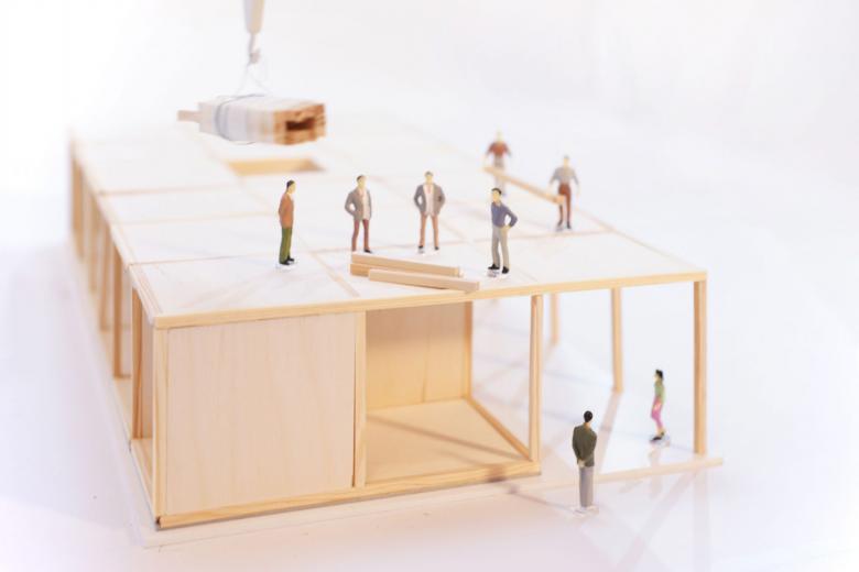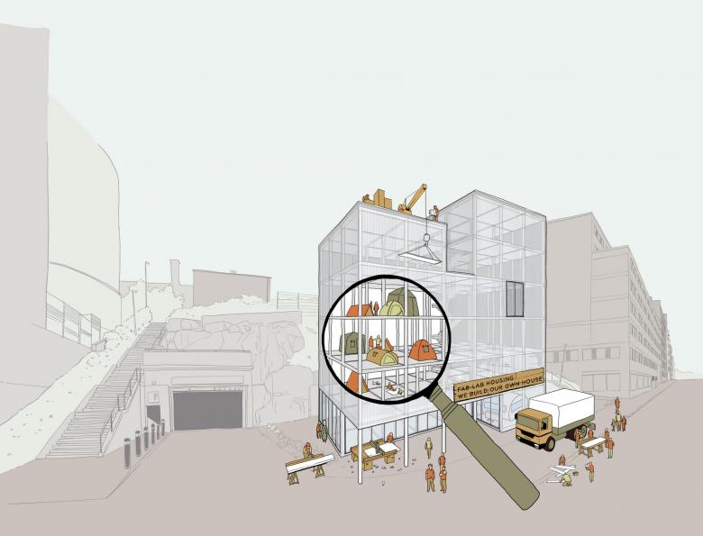 In unserem Konzept haben die Neuankömmlinge die Möglichkeit, bei dem Aufbau ihres neuen Zuhauses mitzuhelfen. Das Bausystem besteht als Primärstruktur aus Holz (Balken und Stützen), Treppen-Kern (Aufzug kann nachgerüstet werden), einer basalen Gebäudehülle aus transluzenten Polycarbonat-Platten sowie je einem Bad und einer Küche je Etage. Dieses Grundsystem kann mit einem Innenausbau, weiteren Fenstern und Sanitäranlagen ergänzt werden. Der Ausbau kann zudem durch eine Zusammenarbeit von Geflüchteten und Freiwilligen geschehen. In der gemeinsamen Arbeit entstehen Kontakte und nachbarschaftliche Beziehungen. Der Ausbau, wie Innenwände und Möbel für die Wohnungen, entstehen in dem im Gebäude untergebrachten Fab-Lab nach einem Open-Source-Prinzip. Das Projekt wird Teil des Wiki-Haus-Netzwerks, welches Entwurfsmuster für Gebäude und Möbel sammelt, austauscht und zur Verfügung stellt.