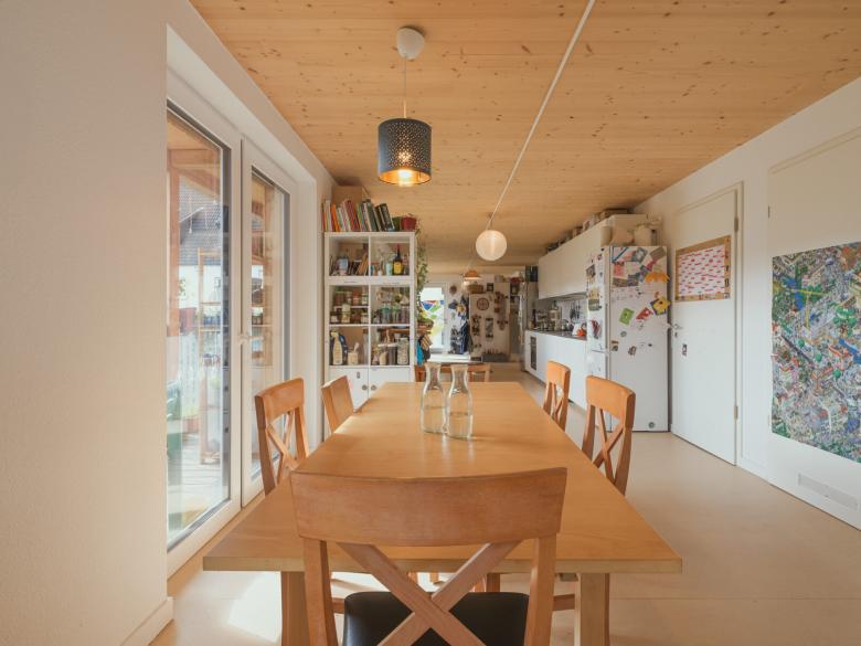 Der Grundriss des Gebäudes besteht auf jedem Stockwerk aus einzelnen Clustern, die unterschiedlich stark autonom sind. Einzelne Cluster sind mit eigenem Bad ausgestattet, andere nicht – diese teilen sich ein Bad mit einem weiteren Cluster. Auf jedem Stockwerk teilen sich die Bewohnenden einen großen Gemeinschaftsraum zusammen mit einer Gemeinschaftsküche. Es entsteht ein Mix aus privaten Rückzugsräumen in den einzelnen Clustern und einer großzügig geschnittenen Gemeinschaftsfläche. Hier wird eine bestmögliche Umsetzung der Idee eines Zusammenlebens vieler Menschen auf wenig Raum angestrebt. Die Begegnungsfläche lädt zum regelmäßigen Austausch ein und macht ein gemeinschaftliches Leben möglich, bei dem etwa Carearbeit zusammen gestaltet und geteilt werden kann.