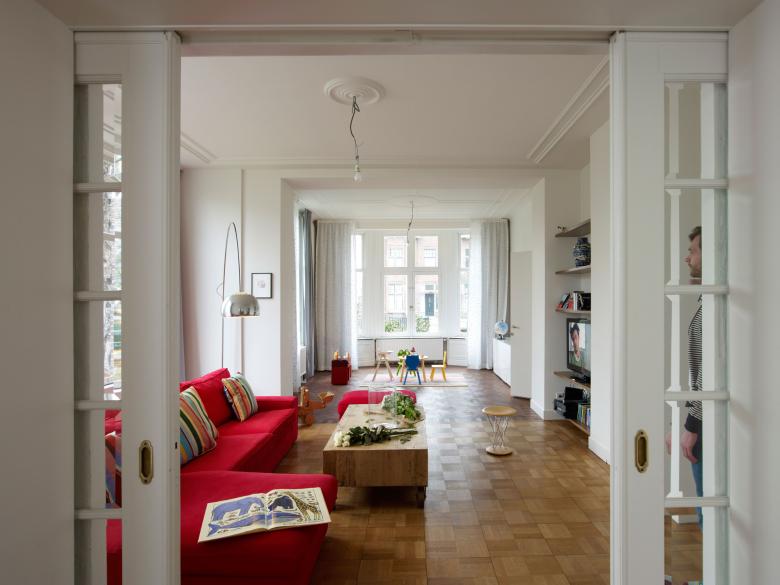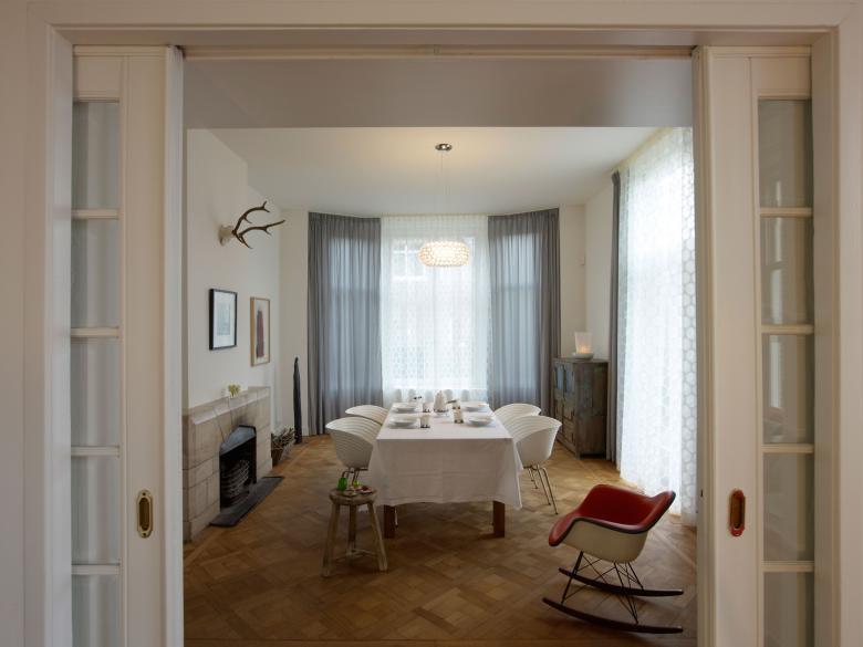 Das Herrenhaus aus 1917 im geschützten Stadtbild von Kralingen wurde komplett renoviert und innseitig wärmegedämmt. Während die Raumeinteilung größtenteils aus dem Bestand stammt, wurden wichtige Elemente grundsätzlich neu gestaltet. Küche und Bad sind mit klar definierten Einbauten in großzügige Wohnräume konzipiert und überformen den Bestand nicht als Bade- oder Kochzimmer.