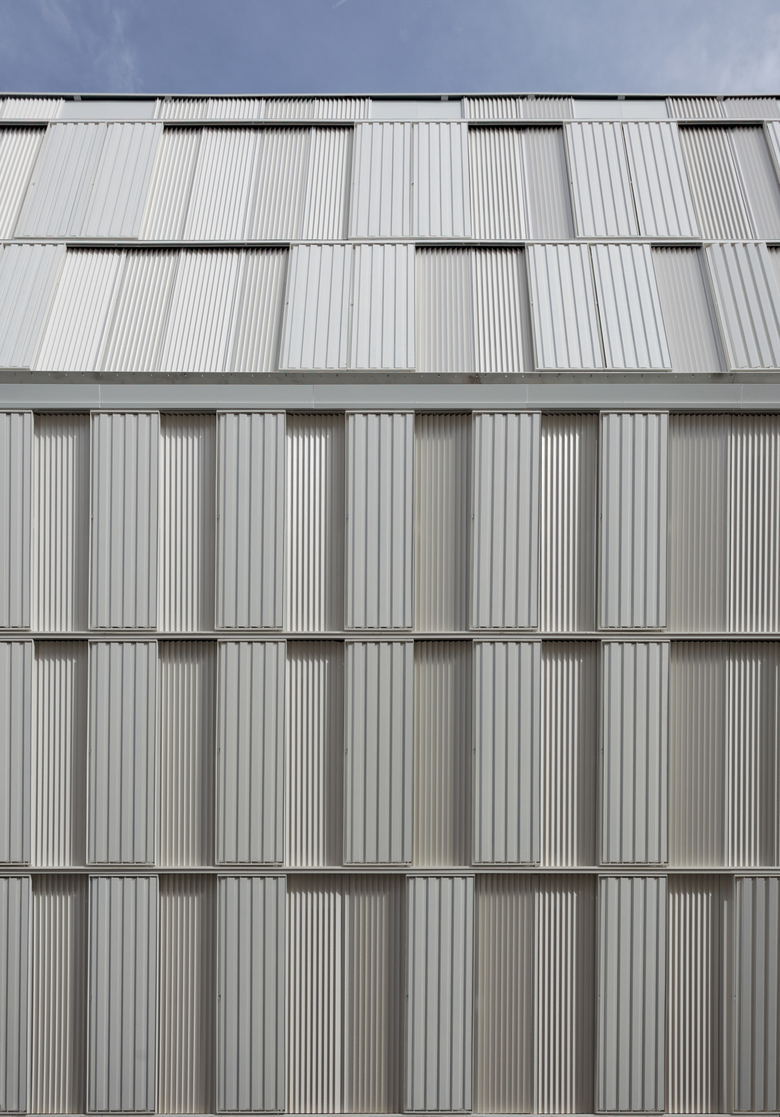 Le traitement de la façade est homogène sur l’ensemble, y compris la partie inclinée. Elle est constituée de fines lamelles métalliques verticales blanches et de panneaux coulissants devant les fenêtres. Ces panneaux sont composés des lamelles mobiles afin d’assurer la protection solaire. Les fenêtres soulignent la verticalité de la structure.