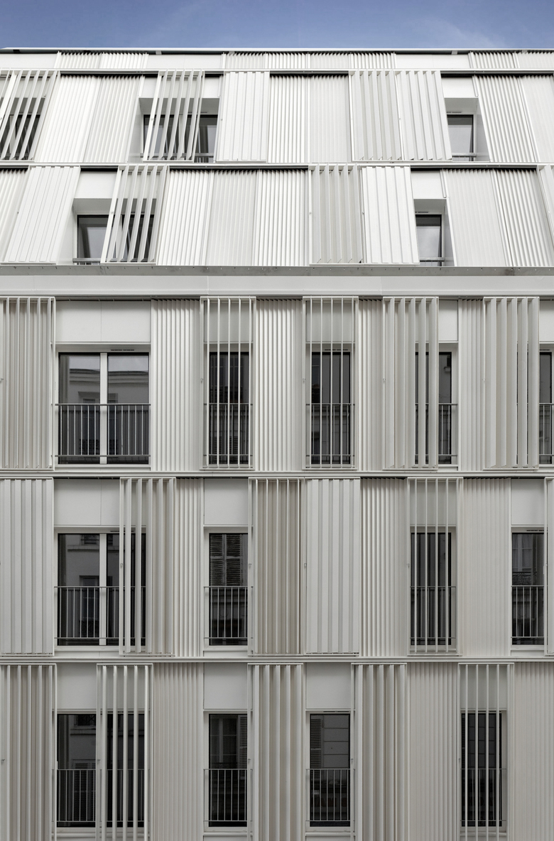 L’immeuble est couvert d’une vêture en lamelles métalliques blanches qui répond à la couleur dominante du quartier. Son écriture est contemporaine et répond à la finesse et au souci du détail de certains immeubles du quartier. Le rythme des percements reprend celui des immeubles alentour et les grandes ouvertures verticales s’inspirent des fenêtres parisiennes.