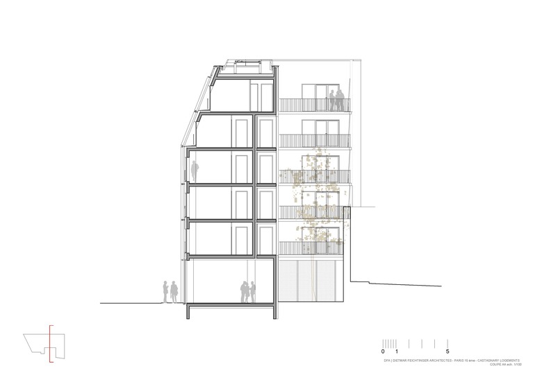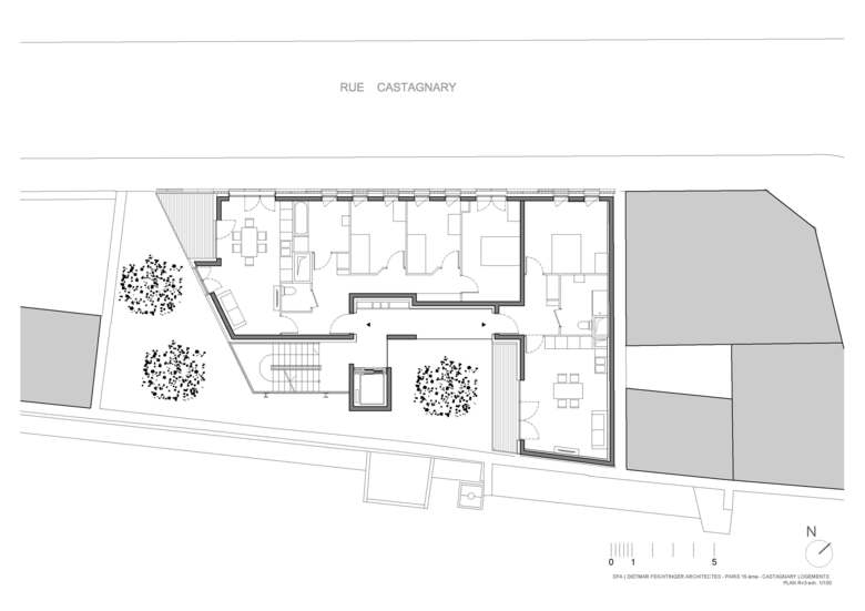 Le nouveau bâtiment s’aligne sur la rue Castagnary et se développe en L avec un retour contre l’immeuble voisin au nord. Sensiblement du même gabarit que l’immeuble existant, il instaure une relation visuelle avec les constructions qui lui font face. Son échelle intermédiaire assure la continuité urbaine et la densité du quartier.