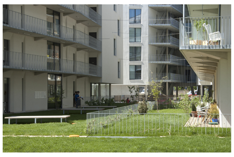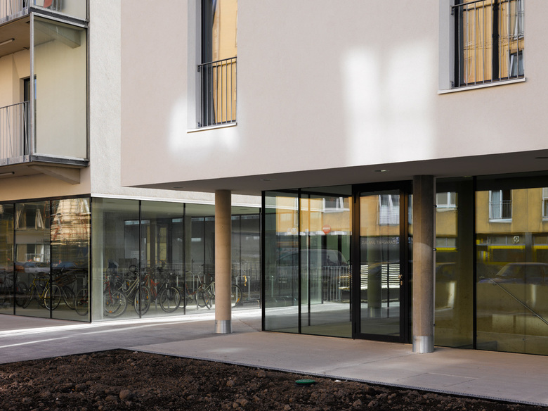 Le rez-de-chaussée formé d’un socle surmonté de la façade principale apporte de la légèreté à la construction. Il comporte des espaces communs vitrés qui offrent une vue traversante vers les espaces verts entre les bâtiments.