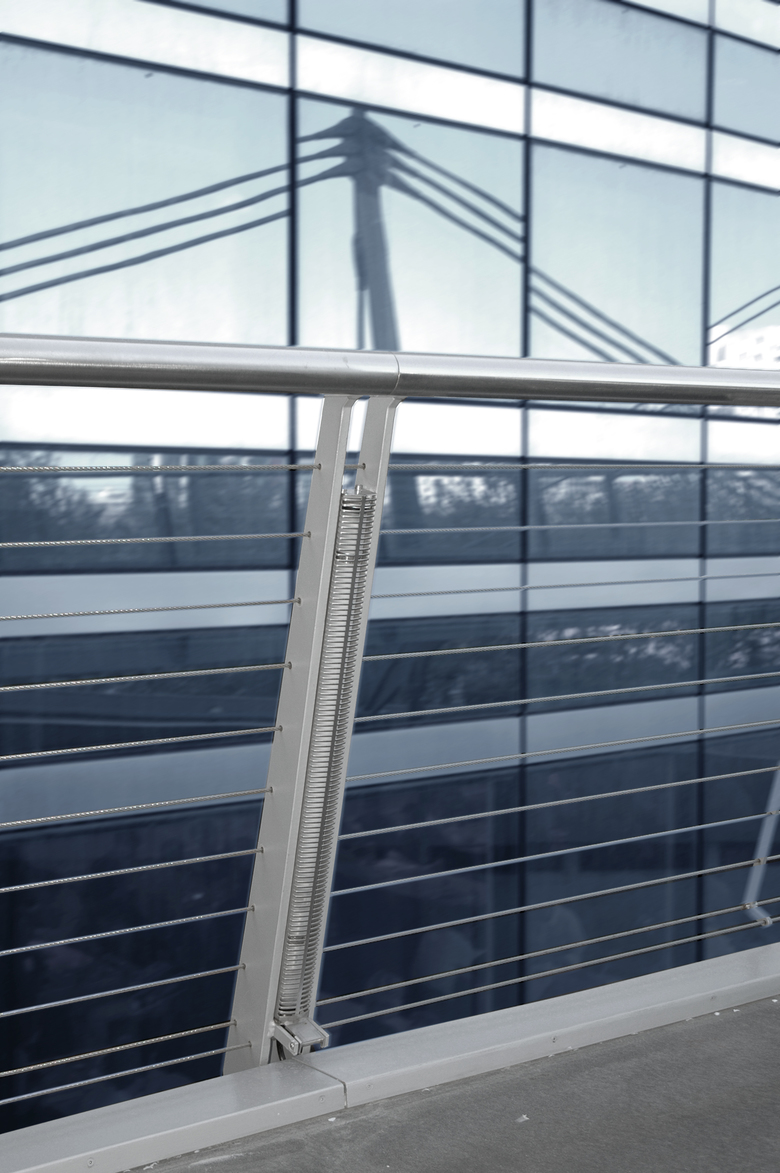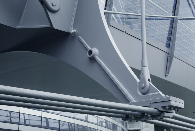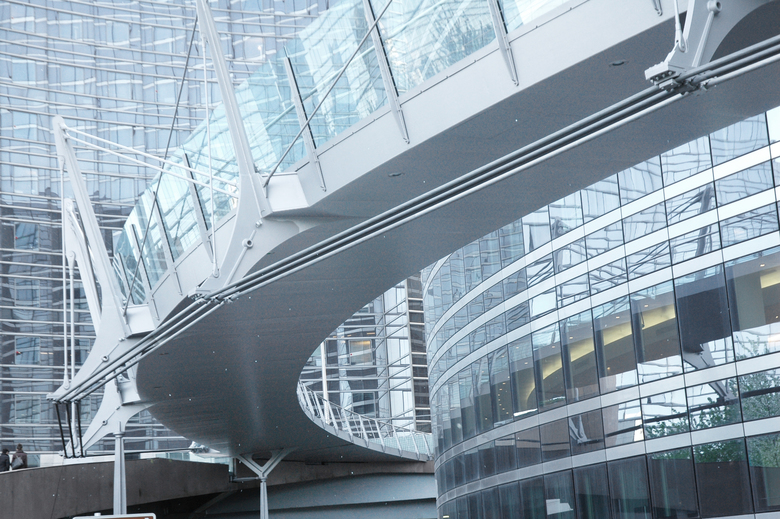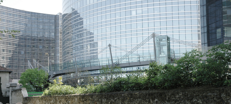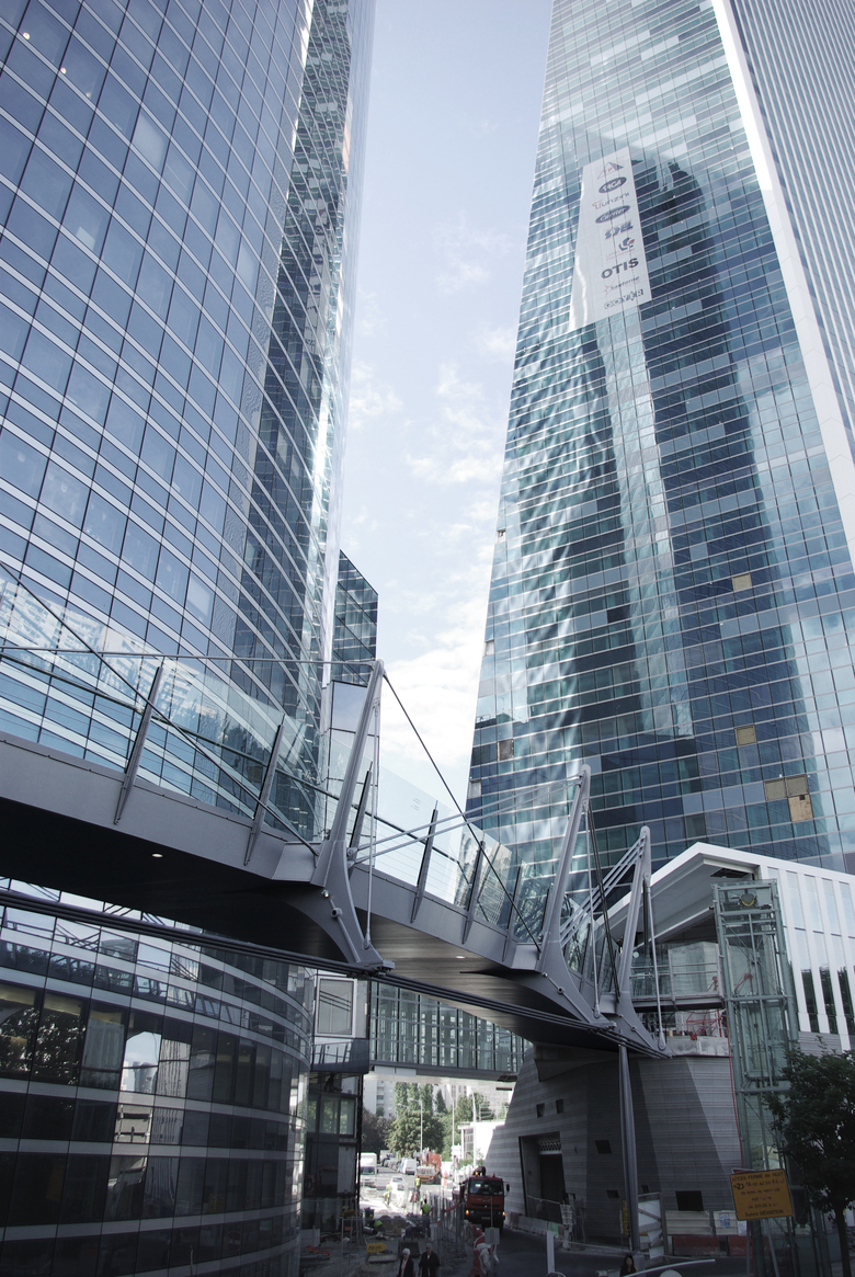 The 88-meter long footbridge is part of a promenade between La Defense and Nanterre. Its layout responds to the geometry of the Société Générale office building. The structure is composed by supporting elements in the form of “vertebras”. The “backbone” of the structure consists of a box girder made of welded steel sheets. The “vertebras” are linked with steel rods forming a cable-stayed structure for the vertical loads. Three cables following the outside edge of the circle situated under the deck level respond to torsion forces.