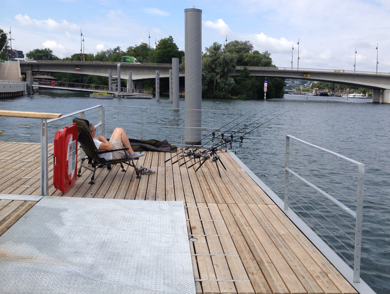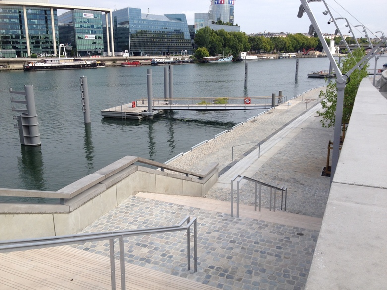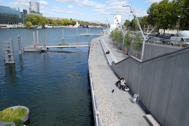Une promenade sur l’eau constituée de pontons flottants, établit à l’extrémité du port sur Issy-les- une véritable île. Son orientation et liens avec le quai bas créent un circuit de promenade qui permet l’accès aux bateaux de croisière et à l’escale des bateaux de passagers. Sa forme linéaire crée un belvédère sur la Seine avec des vues sur le fleuve, l’île St. Germain, Paris et la zone industrielle.