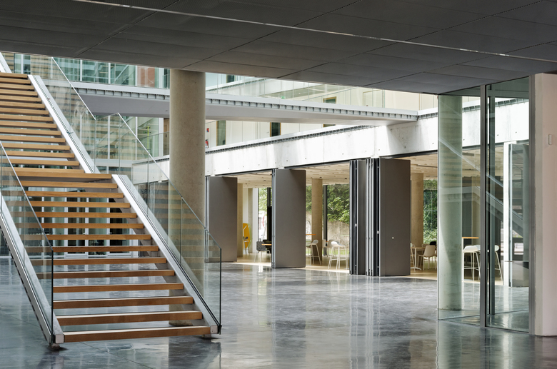 An open central space forms the core of the building. This courtyard, protected by a glass roof, contains an open, central and light staircase. Steel bridges connect the offices on 3 levels and allow easy horizontal and vertical access and communication in the building. Its generous dimension is unexpected. It provides the space for informal meetings. On the ground floor, the restaurant area in the north and the meeting area for seminars in the south complement the central room. Mobile panels make it possible to divide these parts into several work areas for various uses, exhibitions and events. On the office levels, meeting rooms and lounge areas enliven the inner façade with panorama windows facing the inner courtyard. Large wooden terraces inside and outside complete the building on all levels.