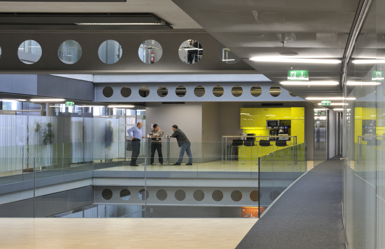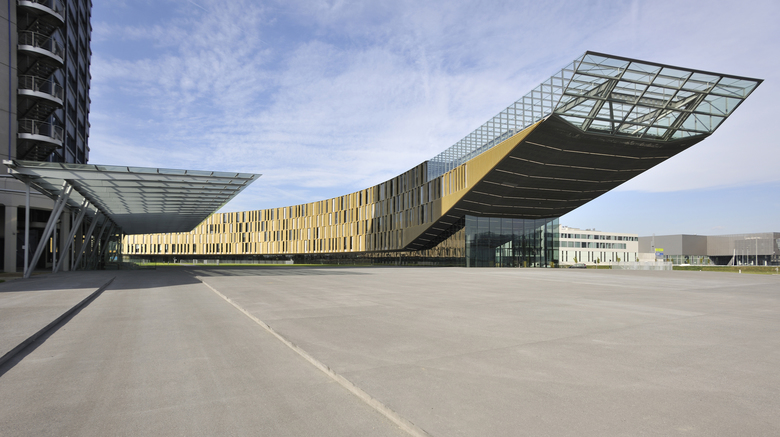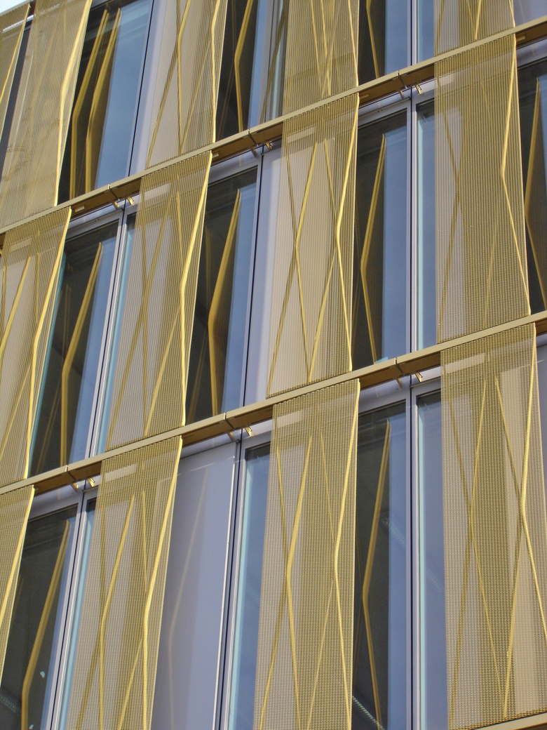 Golden façade, green atria – The offices proper are on the four upper floors that are encased in a shimmering golden façade. They are laid out in a strictly linear, double-loaded fashion, but the curve of the building visually reduces the apparent length. The offices lie along a wide centre zone in which four glass roofed atria are incised. Beside each atrium there is a circulation and services core of exposed concrete, between them are the “living rooms” of the departments. The offices are separated from these communication areas by glass walls, satin-finished in places, which for the staff required some getting used to, as did the restrained colour scheme of the interior: gentle shades of grey are complemented by the light brown of the wooden floors and by strong signal-like colours in the area of the tea kitchens. The relatively narrow subdivision of the façade into full-height opening steel panels and fixed glass elements, also full-height, allows different size offices to be made in accordance with the different requirements. Sliding shade elements of frameless expanded metal on the outside face of the facade and the textile glare protection on the inside ensure agreeable lighting conditions. Dietmar Feichtinger Architectes display the steel construction – columns and open web beams, as well as the concrete of the ceiling slabs. The building services which run only above the corridors can be made out behind their expanded metal cladding. The discipline that this demanded in both design and execution adds a further level of quiet elegance to the overall impression, something that, unfortunately, one can often look for in vain in many a palatial office block.