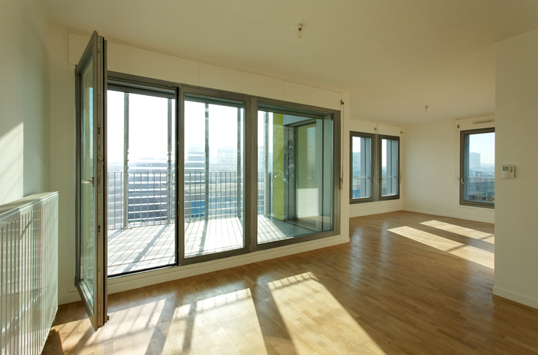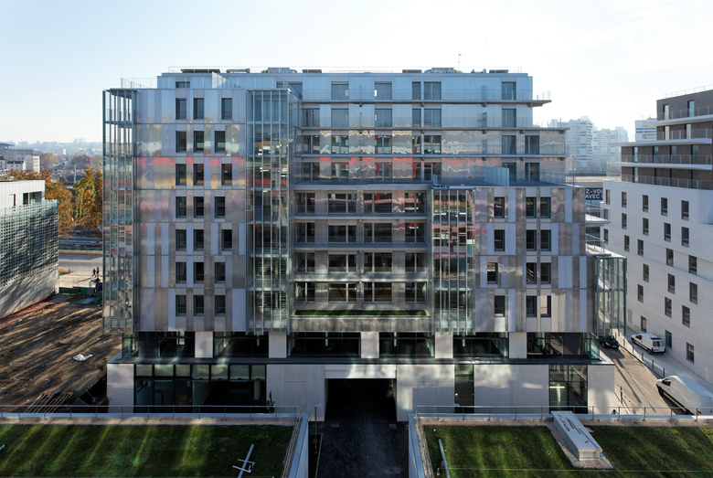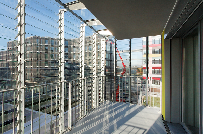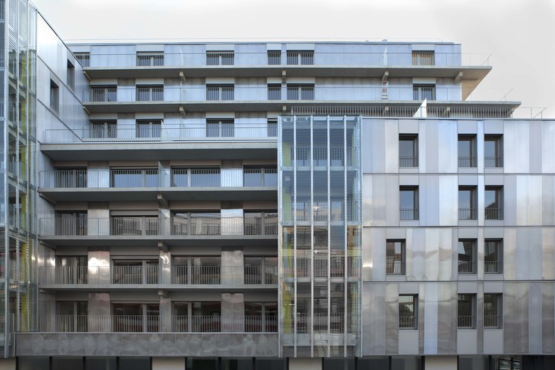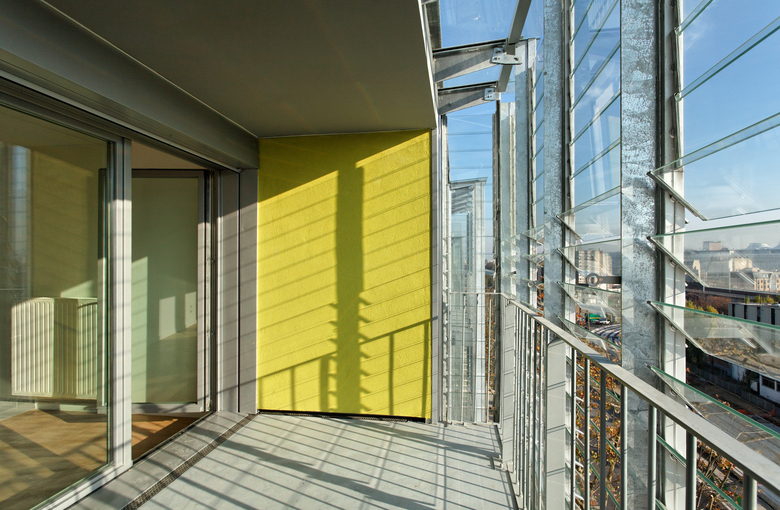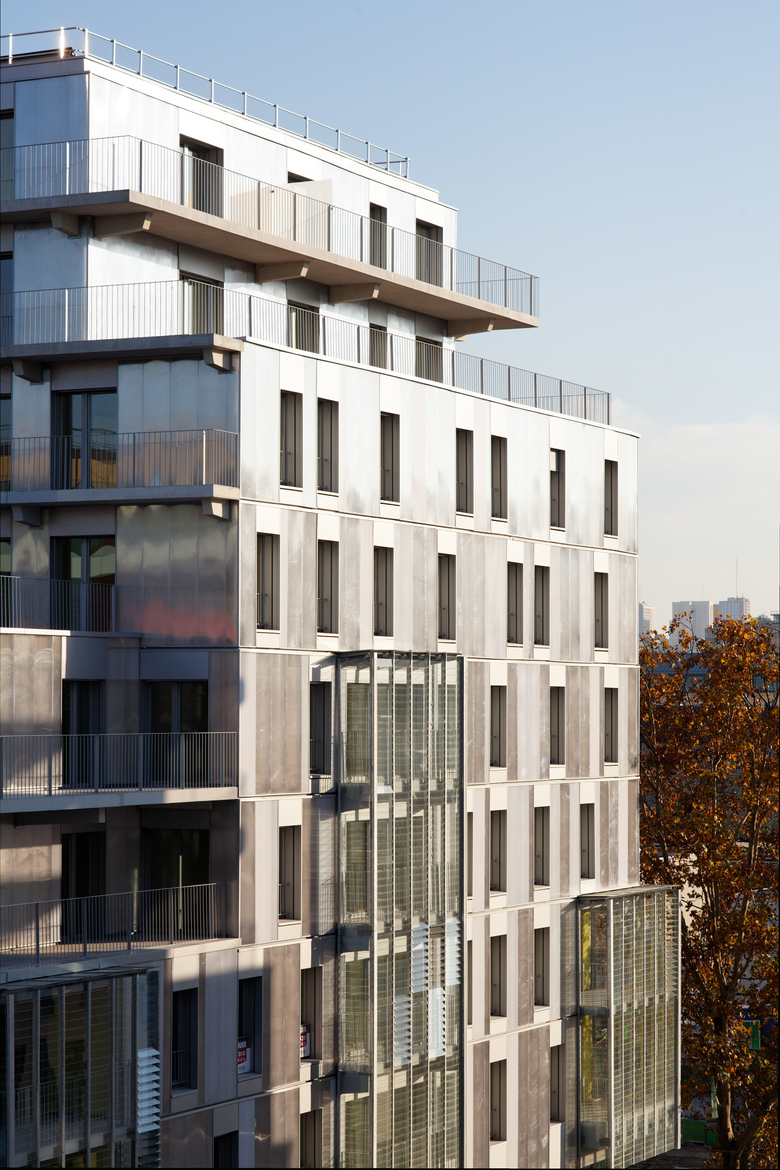 The main façade – south – faces an urban boulevard – Boulevard Mac Donald. The new tram way under construction will serve the area in a few months. Next to the housing, a school group, offices and facilities have been built. The main volume of the housing is 10 stories high and measures 45x32 m. A small patio lights up naturally the center. Shops situated on the ground floor and offices on the 1st floor complete the building. All apartments are double oriented and a generously outdoor space – balcony, roof, terrace or loggia - are provided for each apartment. The outdoor spaces enlarge naturally the living rooms and dining area. The loggias are about 10 m2; their dimension allows the comfortable placement of a table. The apartments are laid out on a grid of 3m20 and offer a multitude of types from studios to large 4/5 room apartments. One of the major topics has been the possible evolution by combining the apartments and adapting them to new situations over generations. The plan, composed of modules allows to reorganize and to resize the apartments. A 30cm low parapet allows vertical openings and assures comfortable natural light in all rooms. Solar panels on the roof provide hot water. A two stories underground parking contains 78 places, storage rooms and a large department for cycles.