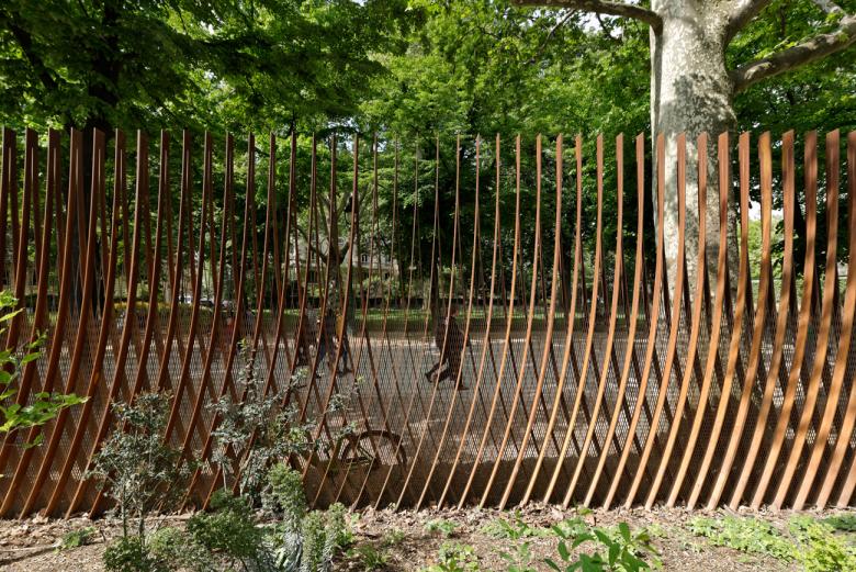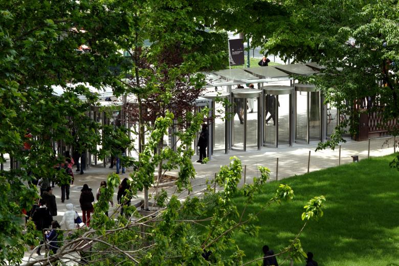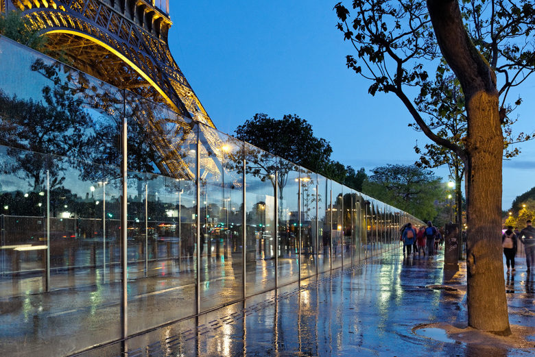 Les profilés sont couverts des tôles fines en acier inox poli afin de mieux se fondre dans le paysage par leur couleur claire et les reflets. Coté Quai Branly les parois son décalées pour intégrer deux sas d’accès/sortie. Coté parvis le socle des parois forme un dispositif haut de 400 mm et peut servir de banc à l’abri des vents du nord et de l’ouest. Coté Avenue Eiffel la paroi en verre se replie sur les allés pour se raccorder aux guérites d’entrée.