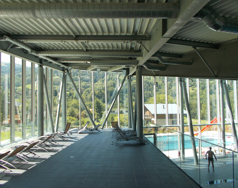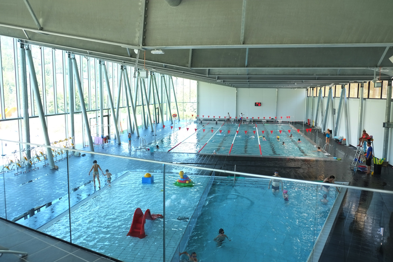 L’équipement aquatique s’inscrit dans la pente naturelle suivant trois niveaux de référence: RDC, R-1 et R-2. Le RDC en relation avec le domaine public regroupe l’accueil du public et la partie administrative de la piscine. Son parvis assure l’ensemble des liaisons piétonnes avec le parking et le reste des cheminements communaux.