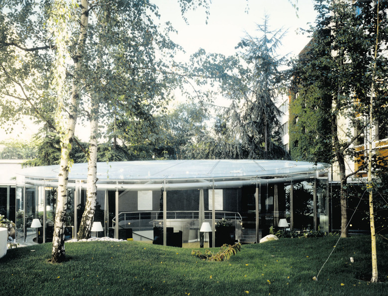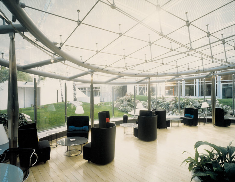 Point de convergence de trois galeries couvertes qui relient trois immeubles de bureaux environnants, le pavillon de verre constitue un espace d'accueil de rencontre et détente. Il abrite au sous-sol un restaurant et un auditorium. Ses parois vitrées assurent une continuité visuelle entre l'intérieur et l'extérieur, elles permettent de profiter du jardin depuis l'intérieur. La toiture de verre sérigraphié tamise la lumière et filtre la vue des immeubles qui surplombent le pavillon, préservant ainsi son intimité. La structure de la toiture, composée d'un anneau de compression périphérique portant une double résille de câbles précontraints, confère une grande légèreté et un aspect aérien à cet espace.