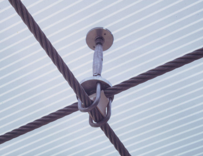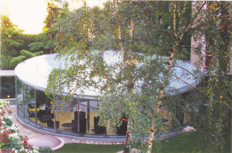 Bâtiment d’accueil. Diamètre de l'anneau : 14 m. Structure câblée précontrainte sur un anneau périphérique, vitrage de la verrière en verre agrafé.