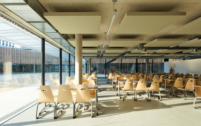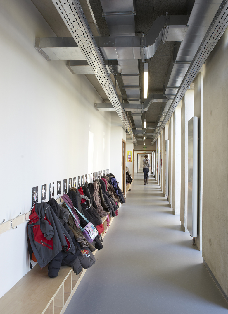 The building – The entire school building is surrounded by a corridor. This bright corridor with windows in different sizes, gives direct access to the classrooms and facilities. The corridor also provides an effective noise control for the exclusively to the courtyard orientated classrooms. All classrooms are extremely quiet and sunny thanks to their orientation.