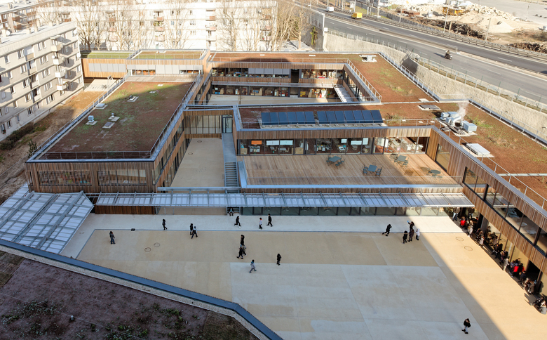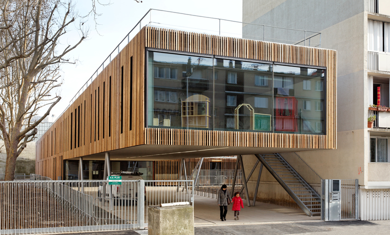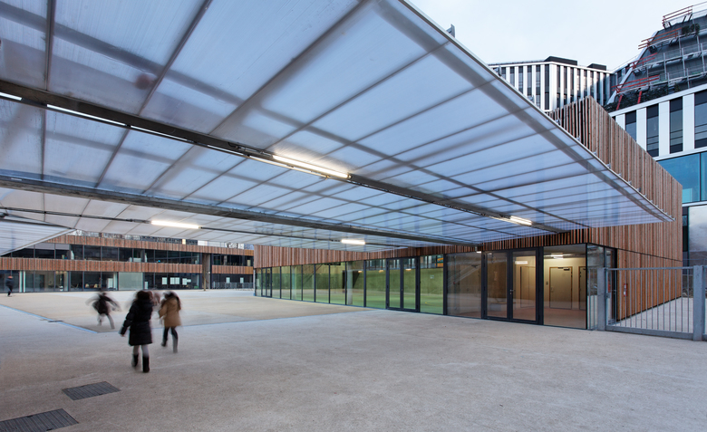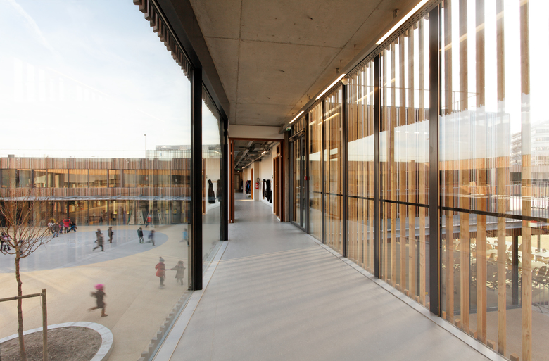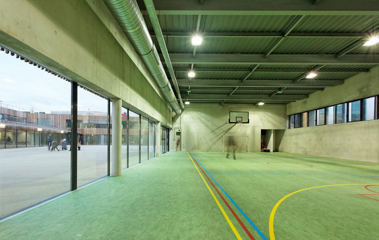 A public institution with a strong identity – The school is distinguished by its spatial organization and design of the facades of their surroundings. The free form differentiates the building from its environnement of rigid social housing characterizing the area ‘Province de France’ in Nanterre. There is a relationship point of view (a view relation) with the Paris business district La Défense. The highly frequented, Route Nationale 314 runs west to the school building. The site was excavated and earth mound planted. The school complex is organized around two courtyards that offer children different outdoor areas. The yard of the kindergarten was designed as a square, the courtyard of the elementary school as a trapeze. In the south, the campus has been completed by the gym. To the east is the 'Centre de Loisirs', a day home for in France generally established full-day school. The day home also is open to the residents of the neighborhood Province de France, and acts with its library and documentation center as 'house of the neighborhood'. The main entrance of the school is located in the north under the overhanging volume of the library. Visible from the rue de Savoye, it offers a generous covered forecourt for parents and children. Under this covered forecourt there are also bike racks. The location of the lodge allows the control of visitors and students. The young children have a direct access from the covered outdoor area to the hall of the kindergarten. The entrance of the elementary school is situated on the west and can be reached from the forecourt via a covered walkway along the building.
