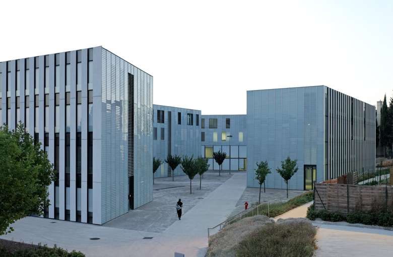 One of the essential characteristics of Aix-en-Provence campus that results from its difficult topography (a steeply sloping site) is the existence of small open spaces directly in front of the buildings. They all represent recreation spaces along the routes through the campus. Feichtinger takes up this urban pattern: he divides up the brief into three small blocks of different sizes and configurations in this way creating a virtual rectangle whose centre is an empty area. The placing of this ensemble, which is set back from the road, avoids direct confrontation with the context. You enter the campus by crossing this space. The layout of the buildings creates two directions, two streets that lead the students either to the main buildings on the higher ground of the campus, or to the neighbouring library. This quiet place, with proportions comparable to a large internal courtyard, forms a calm entrance to the campus both with regard to the external context and to the steep routes that the students must follow to reach the individual buildings that step up the slopes.