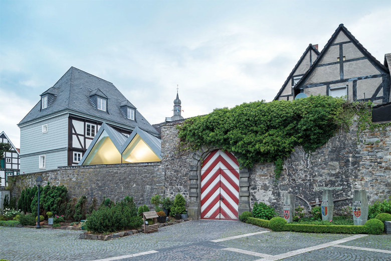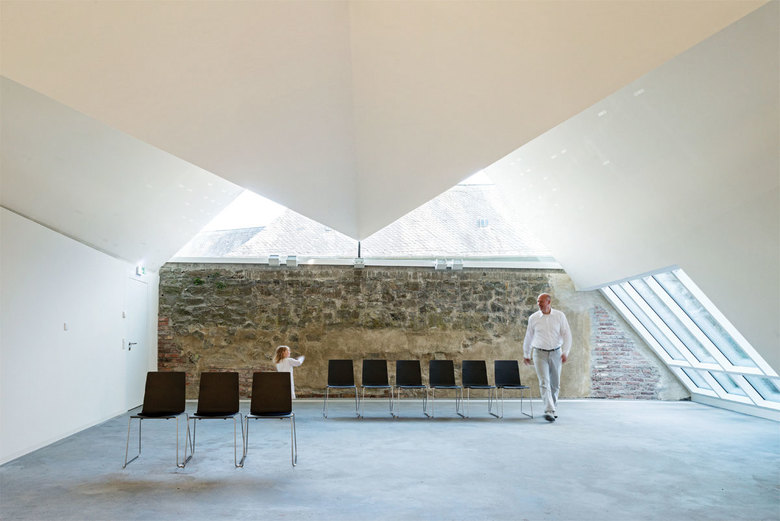 Erweiterung eines zeitgemäßen Multifunktionsraumes mit Mediathek und Verwaltung. Der Innenraum wird geprägt durch das Faltwerk und durch die historische Bruchsteinmauer. Das natürliche Licht wird über ein glänzendes, grafisches Raster im Fensterbereich, je nach Blickwinkel des einfallenden Lichtes, geschluckt oder reflektiert. Die künstliche Beleuchtung akzentuiert die Dachfaltung und ermöglicht eine gute Grundausleuchtung. Ergänzt durch flexible Standleuchten kann der Raum unterschiedlichen Nutzungen gerecht werden.