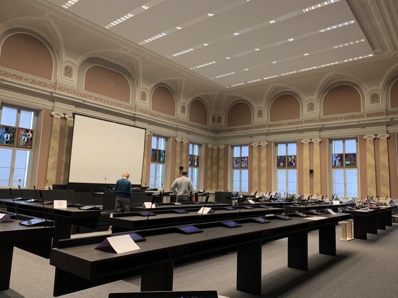 Gesamtsanierung Landratsaal im denkmalgeschützten Bestand mit zeitgemässer multimedialen Einbindung.