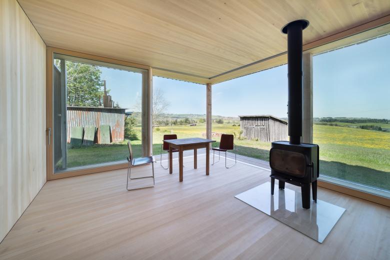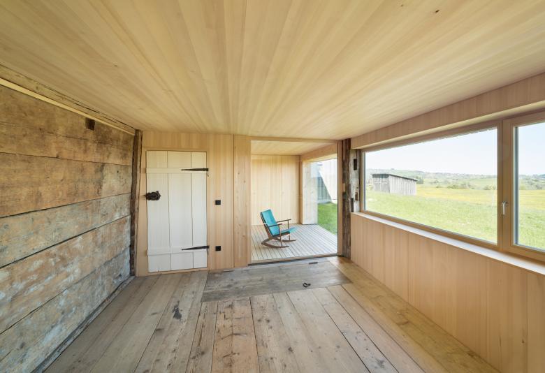 Historische Baumaterialien wurden wo möglich an Ort und Stelle belassen, in einigen Fällen aus- und wieder eingebaut, schadhafte Teile in gleicher Weise mit neuem Material ergänzt. Das Gebäude wurde großteils unterfangen, die Außenwände außenseitig mit Zellulose gedämmt. Die ehemals verschindelten Schauseiten des Wohnhauses erhielten neue Rundschindeln, alle anderen Seiten, die eher landwirtschaftlich geprägt waren, sind mit sägerauhen Brettern verkleidet. Hier konnten auch größere Öffnungen geschaffen werden, die sich zwar in den Duktus einfügen, aber auch eine Spannung zu den feingliedrigen anderen Bauteilen aufbauen. Neue einfach verglaste Vorfenster verbessern die historischen Fenster.