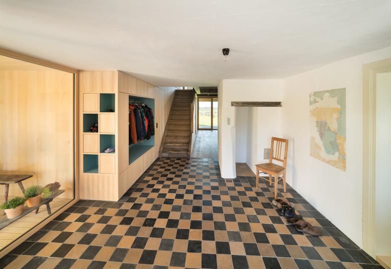 Im Vordergrund stand die Sanierung des Wohnhauses zu Wohnzwecken. Der Rest des Gebäudes sollte hauptsächlich statisch ertüchtigt und die Dachhaut erneuert werden, um den sicheren Erhalt für die nächste Zeit zu sichern. Die Grundrissstruktur des Wohnhauses erfuhr kleine Modifikationen. Das Versetzen der neuen Trennwand zur Tenne um 60cm schafft Stauraum und gibt den großen Fluren in EG und OG eine zusätzliche Funktion. Der neu erstellte Stall dient als Keller-Ersatz, da der Naturkeller nur als Lager für Gemüse und Wein funktionieren kann. Auf der Südseite des Stalls und auf der Nordseite des Flures wurden neue Loggien in das Bauvolumen integriert. Sie bieten überdachte Freibereiche und großzügige Belichtung der angrenzenden Räume. Die Flächen sind ohnehin groß genug.