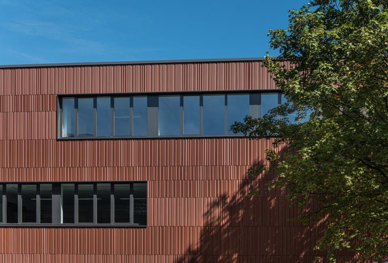 Die Fassade des Neubaus wird durch ziegelrote Keramikelemente, die als Reminiszenz an die Ziegelfassaden der Berufsschulen gestaltet werden. Gegliedert werden die Fassaden durch versetzt angeordnete anthrazitfarbene Bänder aus gekoppelten Holz-Alu-Fenstern. Die Verglasungen werden mit innenliegenden Vorhängen bzw. Rollos ausgestattet, welche als Blend- und Sichtschutz dienen. Die Fachräume erhalten teilweise aufgrund technischer Bedürfnisse eine innenseitige Vollverdunklung.