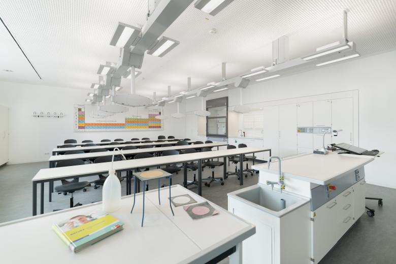 In dem Fachraumcluster wird der lehrplangerechte Fachunterricht gebündelt. Hier können Fertigkeiten und Neigungen der Schüler entsprechend den vier verschiedenen Ausbildungsrichtungen vertieft werden. Es steht ein zeitgemäßes Angebot an Räumen für einen praxisorientierten und anschaulichen naturwissenschaftlich-technischen Unterricht zur Verfügung. Für die Vermittlung der erforderlichen Schlüsselqualifikationen und -kompetenzen für eine späteres Studium bzw. die berufliche Integration stehen im Fachraumcluster fünf integrierte Fachunterrichtsräume (IFU) für Biologie/Biotechnologie, Chemie, Physik, Technologie sowie zwei Nawi-Übungsräume zum Experimentieren und Forschen in den Fächern Chemie, Biologie, Physik und Technologie zur Verfügung. Zudem werden mit dem direkten Unterrichtszweck verbundene Lagerungsmöglichkeiten für Experimente und Material von Schülern und separate, an die Fachunterrichtsräume angrenzenden Bereiche für Vorbereitung und Sammlung sowie zwei Fachräume für IT/Wirtschaftsinformatik, Teamräume und ein Seminarraum für Physik-Referendare angeboten.