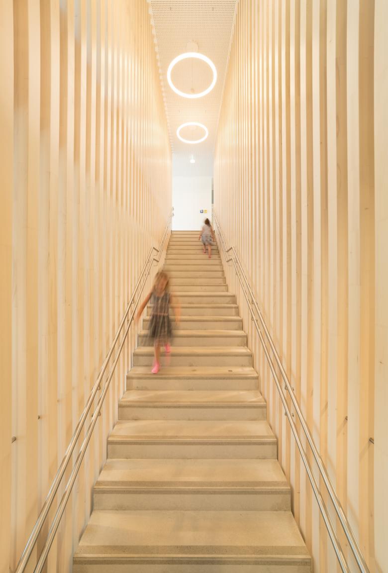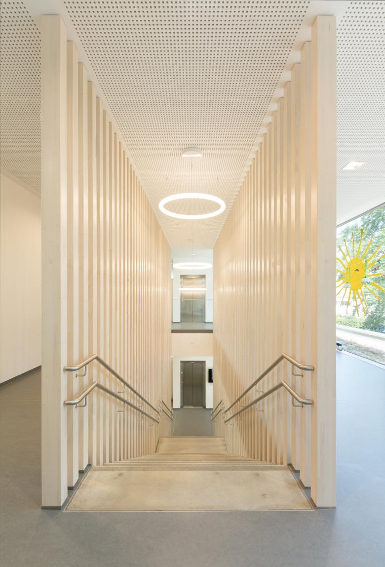 Über die Loggien und Gartentreppen kann der Garten auch direkt aus dem Obergeschoss erreicht werden. Alle Gruppen- und Aufenthaltsräume erhalten somit einen gleichwertigen Bezug zum gemeinsamen Garten. Vertikalerschließung und weitere kleinere Funktions- und Nebenräume sind in der schmaleren Raumzone straßenseitig organisiert. Die Gruppen der Kita sind entsprechend dem offenen pädagogischen Konzept als Rollenspielzimmer, Bauzimmer, Werkraum, Atelier, Lesezimmer, Forscherraum und Snozelenraum für alle Kinder vielseitig und flexibel nutzbar.