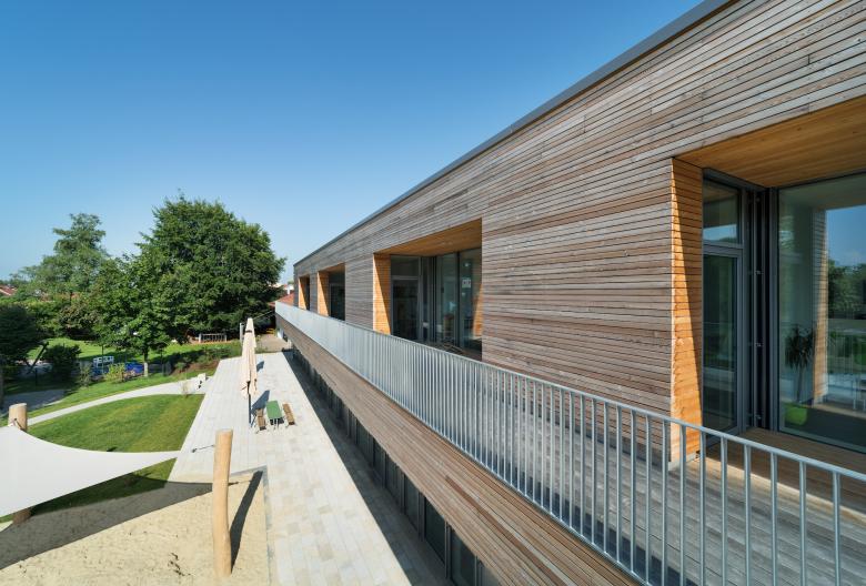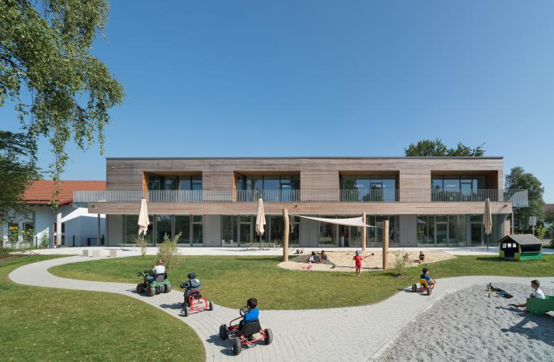 Der städtebauliche Vorschlag im Wettbewerb folgte dem in der Auslobung skizzierten Ansatz: Für die Erweiterung des bestehenden Kindergartens zum neuen Familienzentrum Marktoberdorf sollte das bestehende Gebäude im KG und EG weiter verwendet und umgebaut werden. Die zusätzlich nachzuweisenden Programmflächen wurden als Aufstockung um ein Vollgeschoss und als räumliche Erweiterungen nach Süden und Westen konzipiert. Das neu konzipierte ruhige, lineare Gebäude fügt sich selbstverständlich und homogen in die Wohnbebauung der Ratiborer Straße ein. Die zweigeschossige Kita bildet einerseits zusätzlich ein städtebauliches Ensemble mit den nördlich angeordneten Sonderbauten wie der Kinderkrippe Sonnenschein und der St. Magnus Kirche. Mit seinem klaren Volumen kann sich der neue Baukörper andererseits auch selbstbewusst in der Abfolge der nördlich und südlich anschließenden öffentlichen Gebäude behaupten. Durch die lineare kompakte Organisation wird die zwingend erforderliche Maximierung der verbleibenden Freiflächen erreicht.