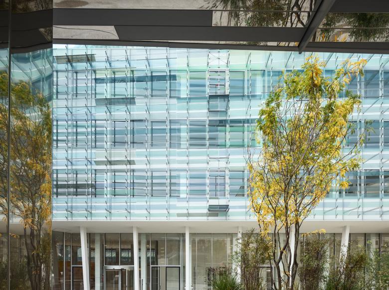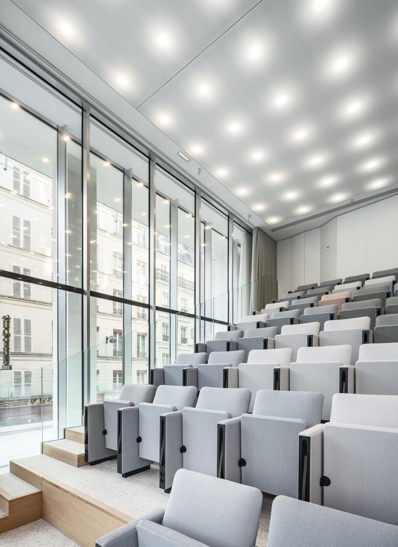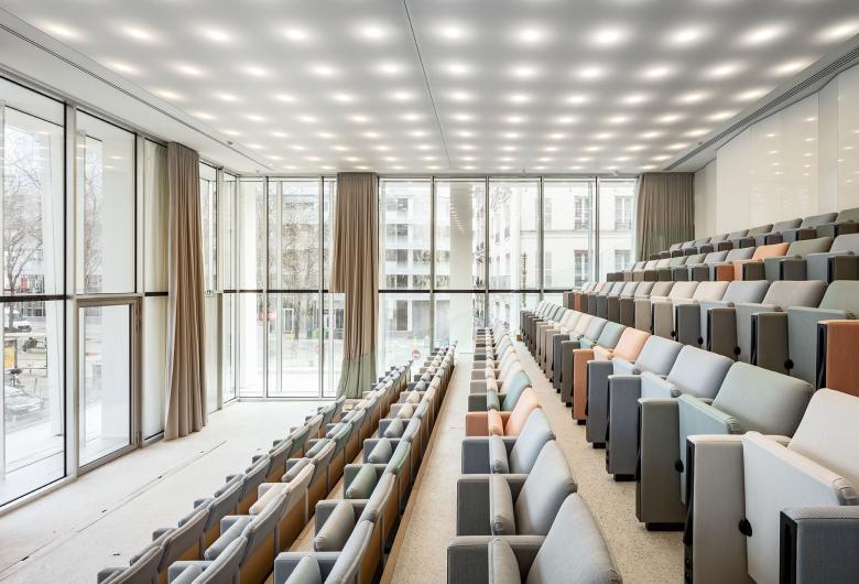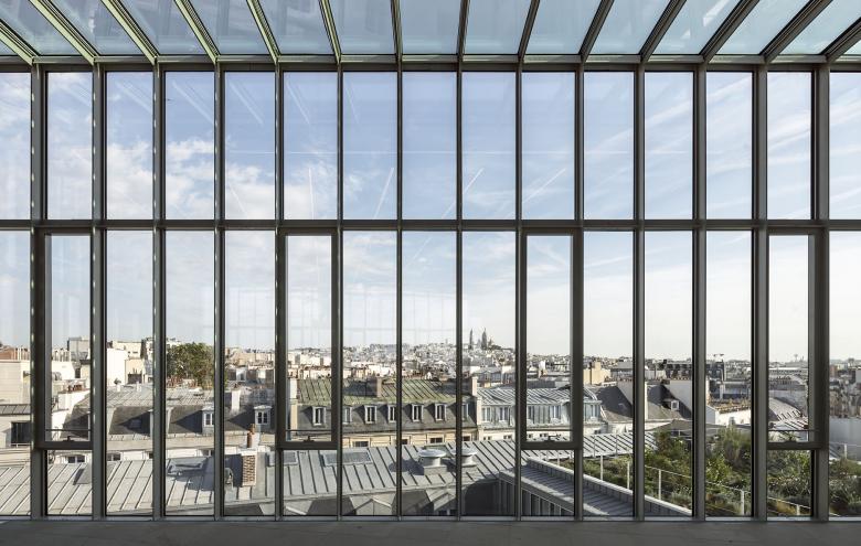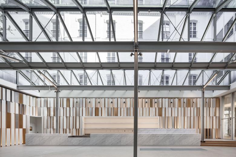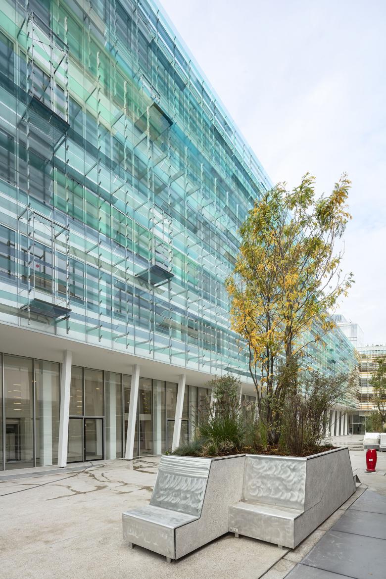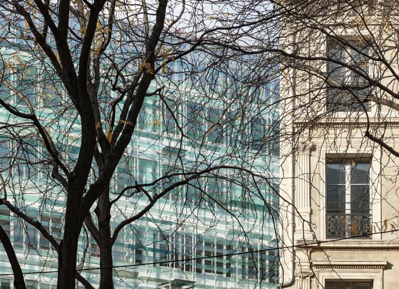 The project is part restoration, part rehabilitation of a significant protected Haussmann building, with the addition of a contemporary 20,000m2 structure, reaching up to seven storeys. The striking contemporary intervention is characterised by a delicately tinted glass grid façade, rising above peristyle lower floors.