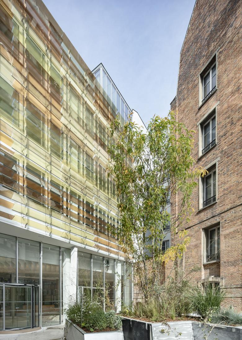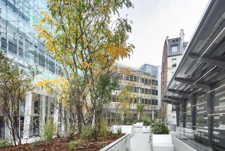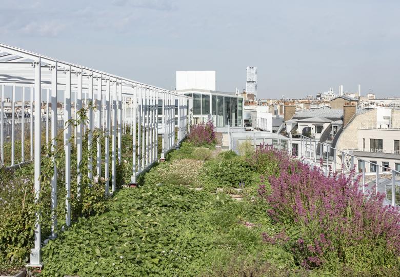 The eco-nourishing system on the rooftop offers 800sqm of urban field with views over Paris, accessible to all of the tenants within the building’s workspaces. The terraces include a wide variety of flora, from edible plants to native varieties of flowers, as well as rainwater management systems, beekeeping, and natural habitats for insects and birds. The plantings of these spaces have been selected to produce year-round edibles, reduce air pollution in the atmosphere, and create a healthier, more sensory environment for the building’s users.