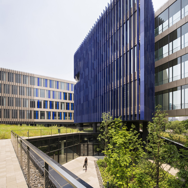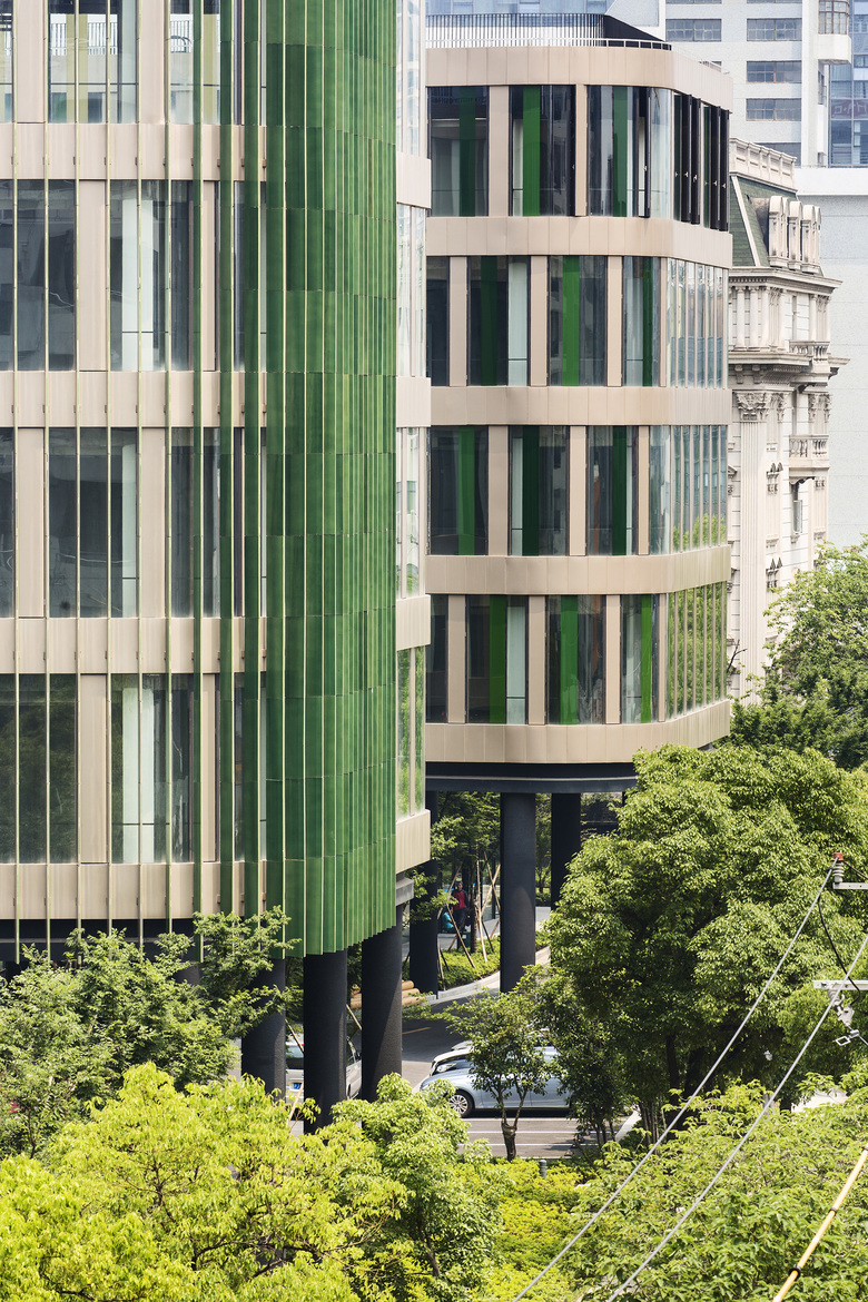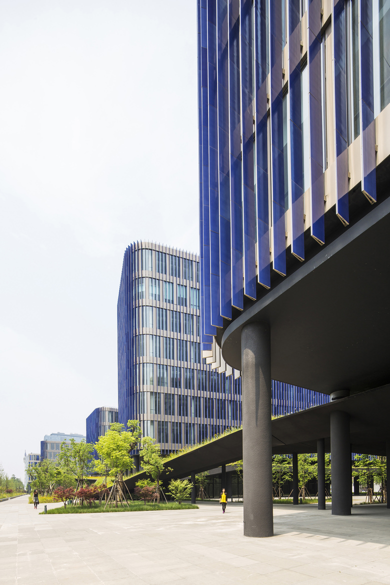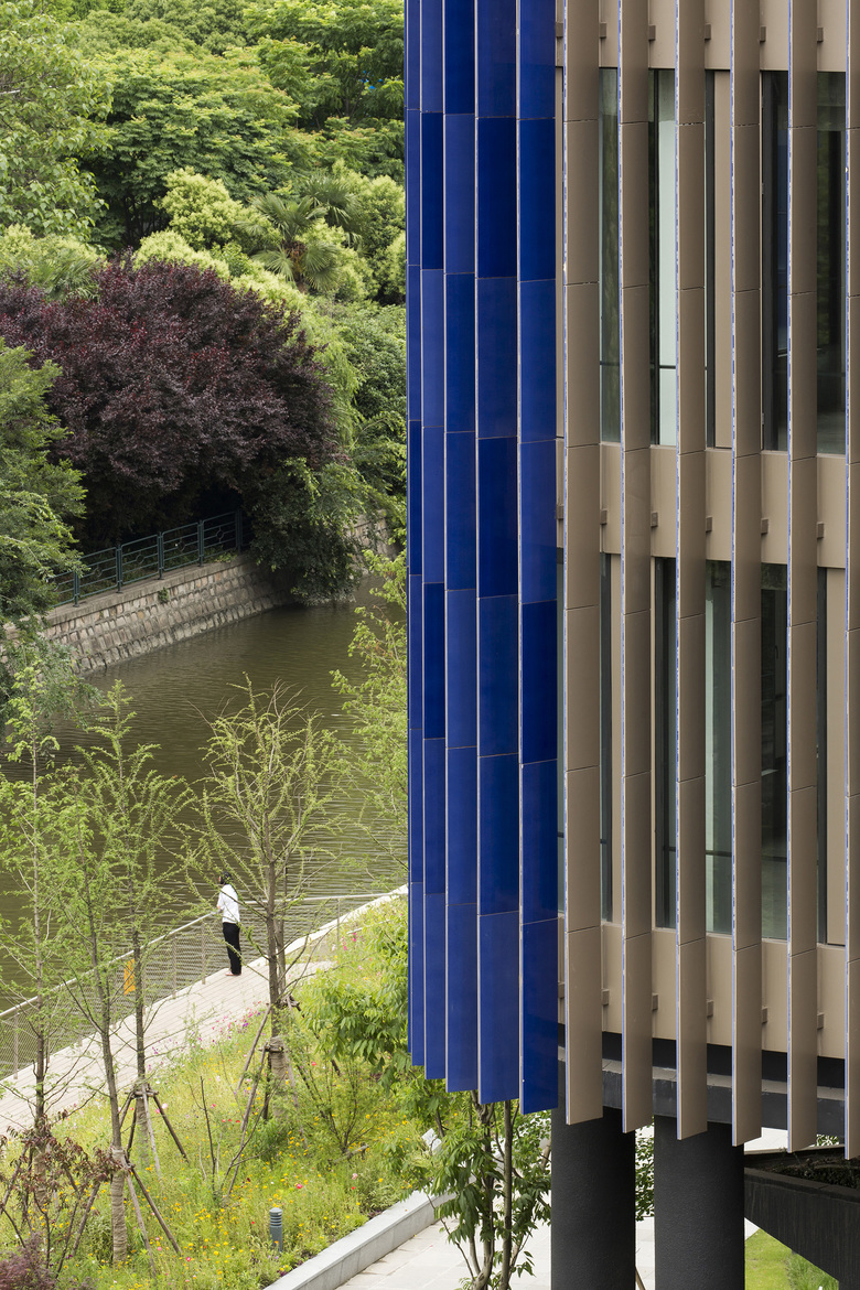 The ensemble's façades are covered in vertical blades which protect the structures from the powerful Shanghai sun. They combine two different materials: one side is covered with pale gold aluminium, and the other with ceramic in shades of green and blue, depending on the façades, a traditional Chinese material created using ancient techniques. This dual interplay of colours and materials creates a sense of movement, a constantly renewed vision of the buildings within the city. Depending on their location, urbanites will see the complex as successively green, blue and golden.