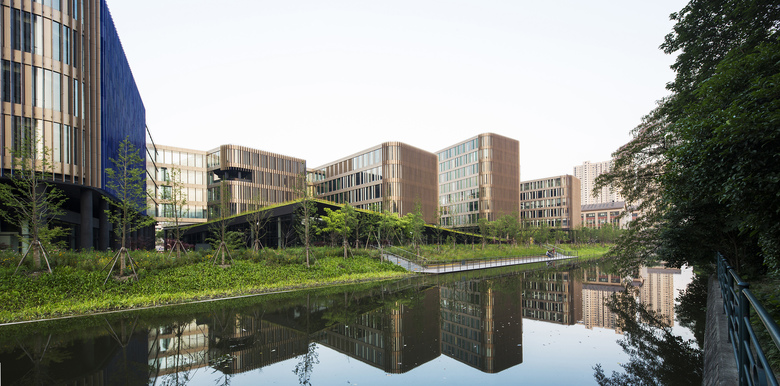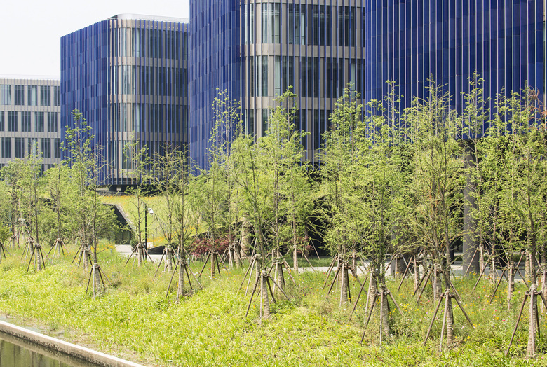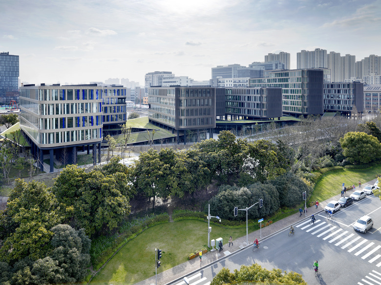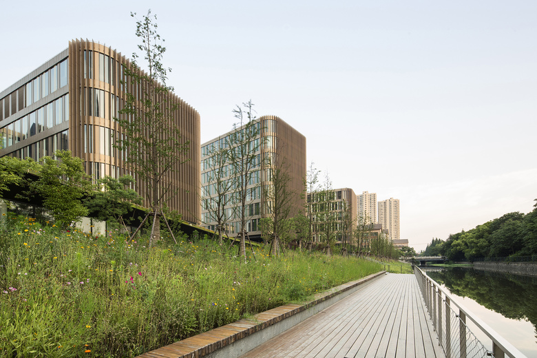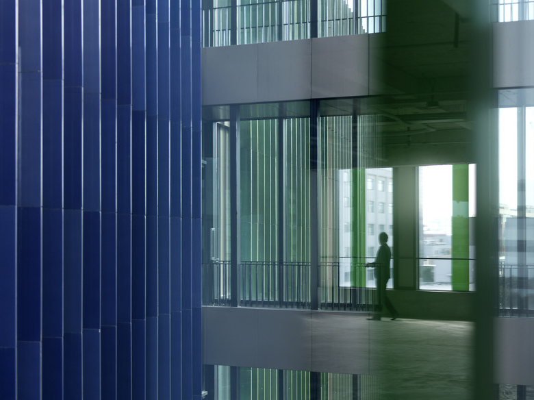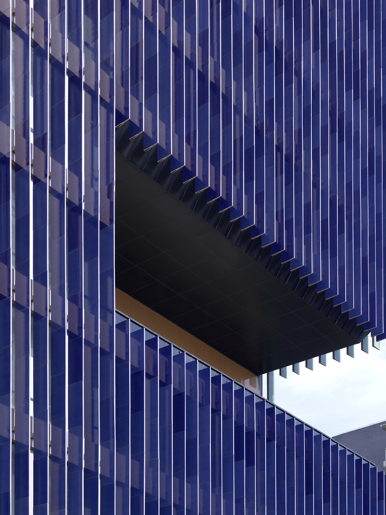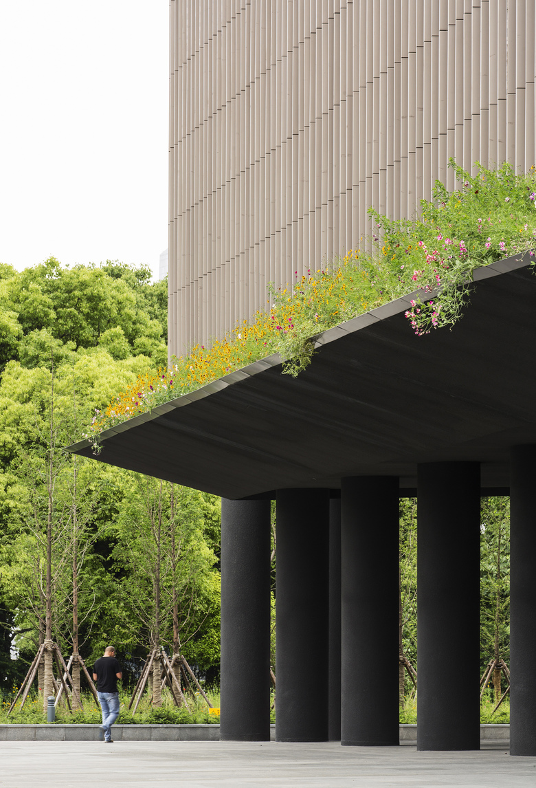 The ensemble's façades are covered in vertical blades which protect the structures from the powerful Shanghai sun. They combine two different materials: one side is covered with pale gold aluminium, and the other with ceramic in shades of green and blue, depending on the façades, a traditional Chinese material created using ancient techniques. This dual interplay of colours and materials creates a sense of movement, a constantly renewed vision of the buildings within the city. Depending on their location, urbanites will see the complex as successively green, blue and golden.