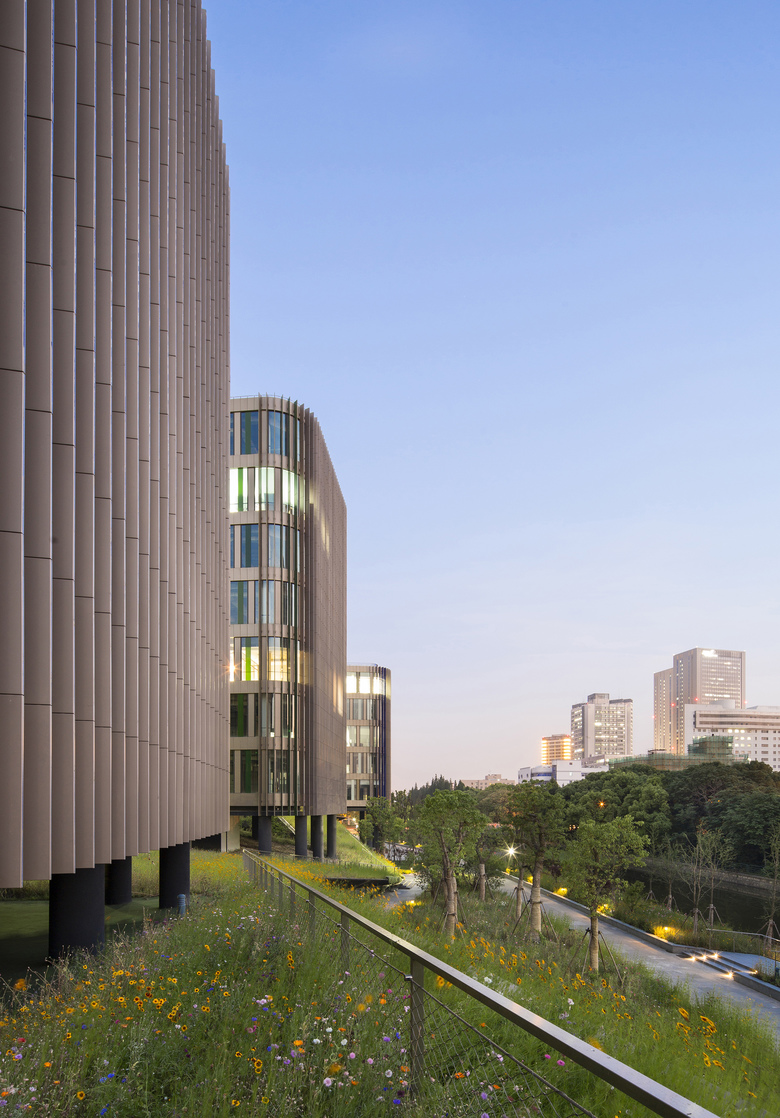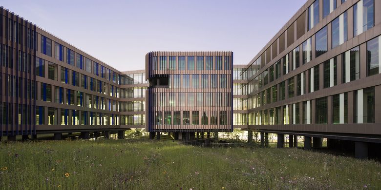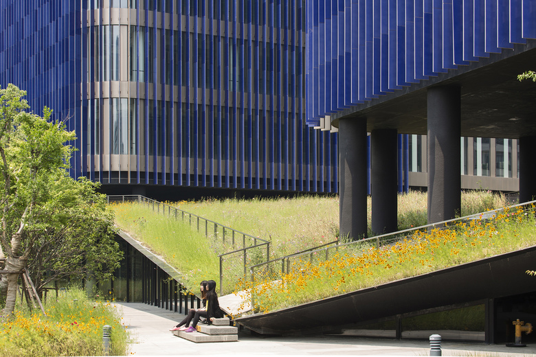 This landscape-type design encourages permeability, in response to environmental concerns. More than a third of the site's surface area is dedicated to green spaces, not including the foundation of the office structure, which is also treated as a garden.